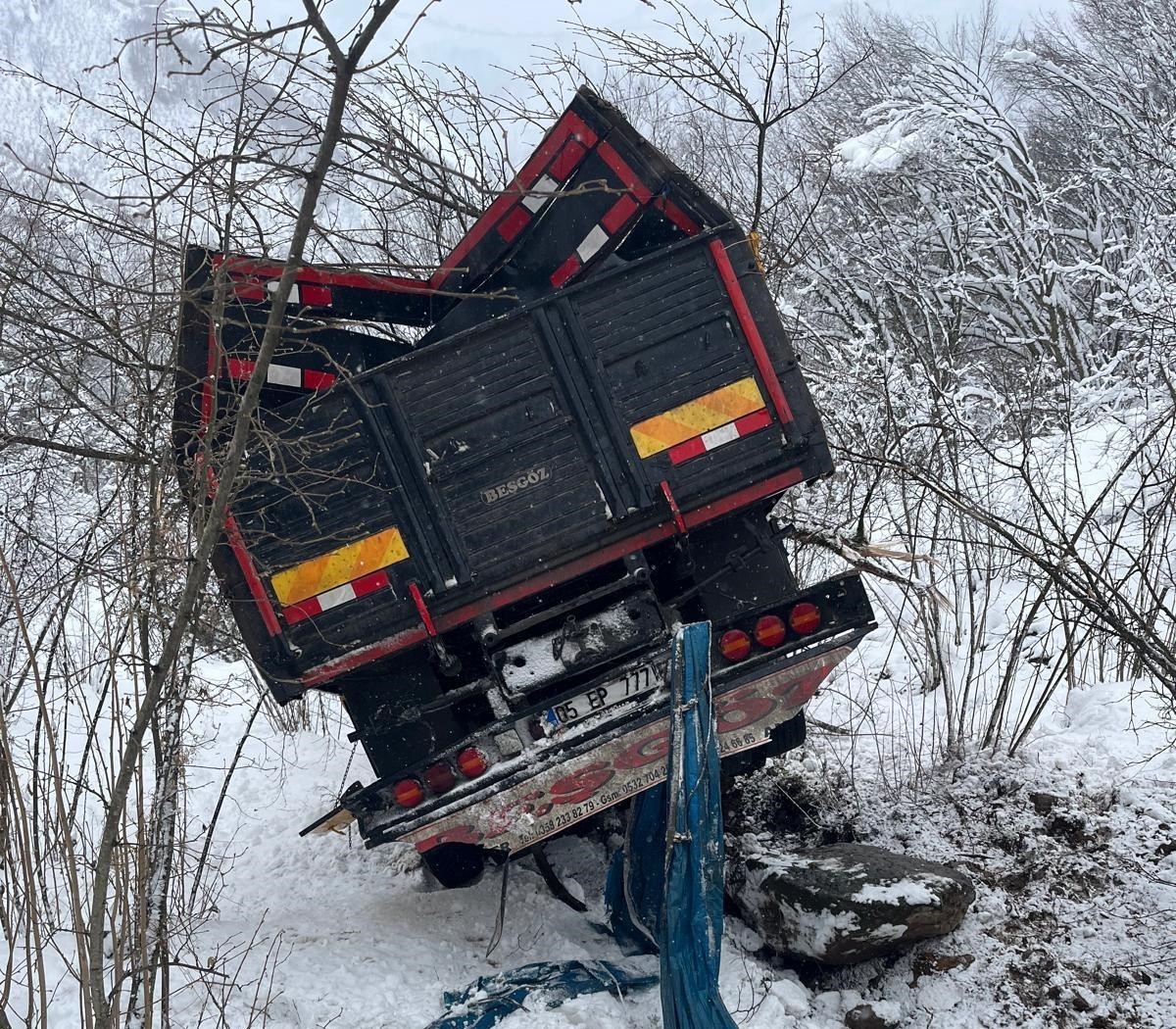 Kaza, ilçenin Tepe Mahallesi, Köyceğiz Küme Evleri mevkiinde dün öğle saatlerinde meydana geldi. Edinilen bilgiye göre, E.Ö.’nün (36) kullandığı 05 EP 777 plakalı yem yüklü tır, kar nedeniyle oluşan buzlanma sonrası kayganlaşan yolda sürücüsünün kontrolünden çıktı. Tır, yaklaşık 600 metrelik uçuruma yuvarlanırken, araçtan atlayan sürücüsü ise yaralandı. İhbar üzerine olay yerine sağlık ve polis ekipleri sevk edildi. Sürücü, sağlık ekiplerinin ilk müdahalesinin ardından ambulans ile Fatsa Devlet Hastanesi’ne kaldırıldı.