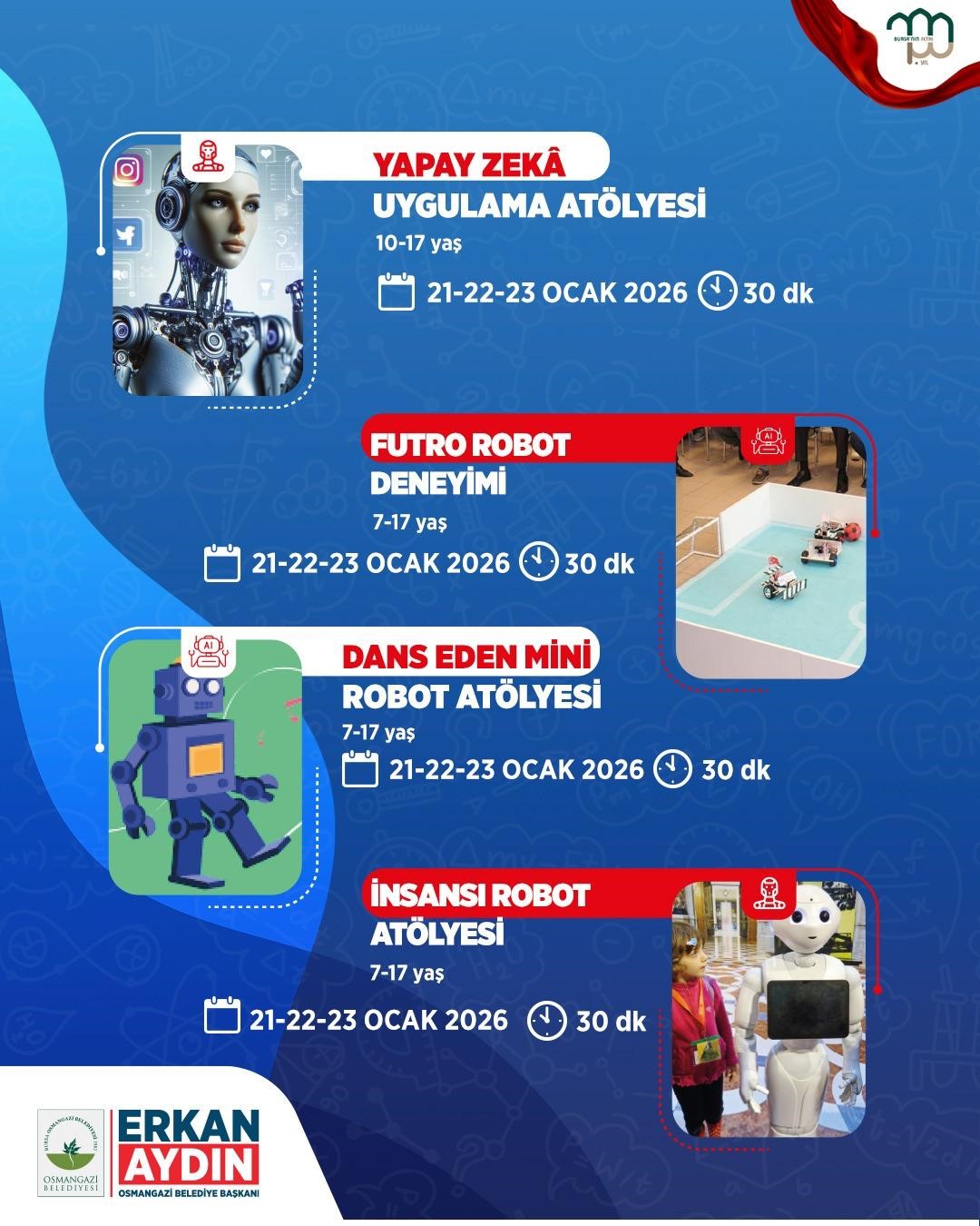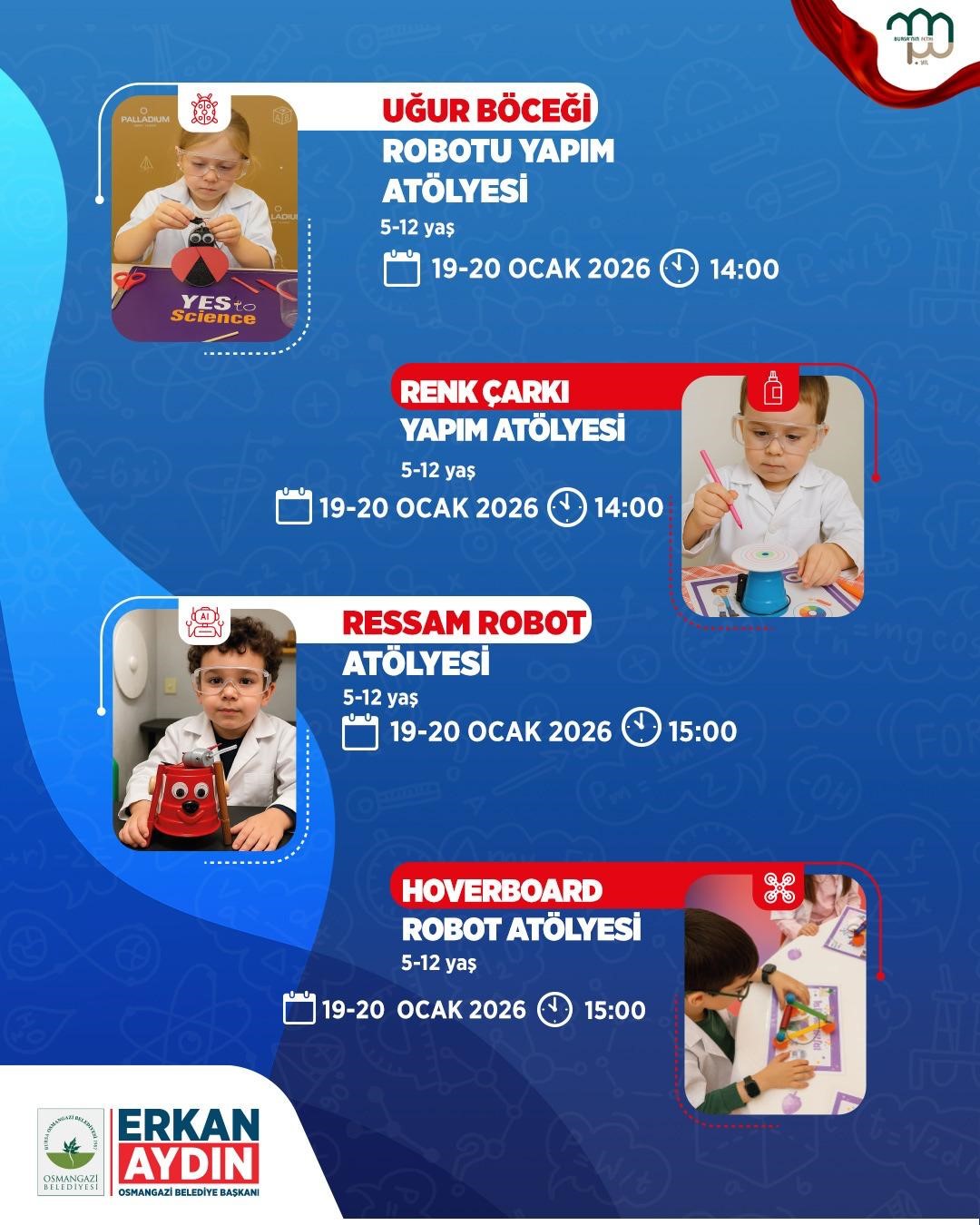 Bursa Osmangazi Belediyesi, 7-17 yaş arasındaki çocuklar ve gençler için dopdolu bir Bilim Şenliği düzenlemeye hazırlanıyor. Osmangazi Gösteri Merkezi’nin ev sahipliğinde 19-23 Ocak tarihleri arasında düzenlenecek olan şenlik, bilim ve teknoloji meraklısı çocuk ve gençleri bir araya getirecek.
