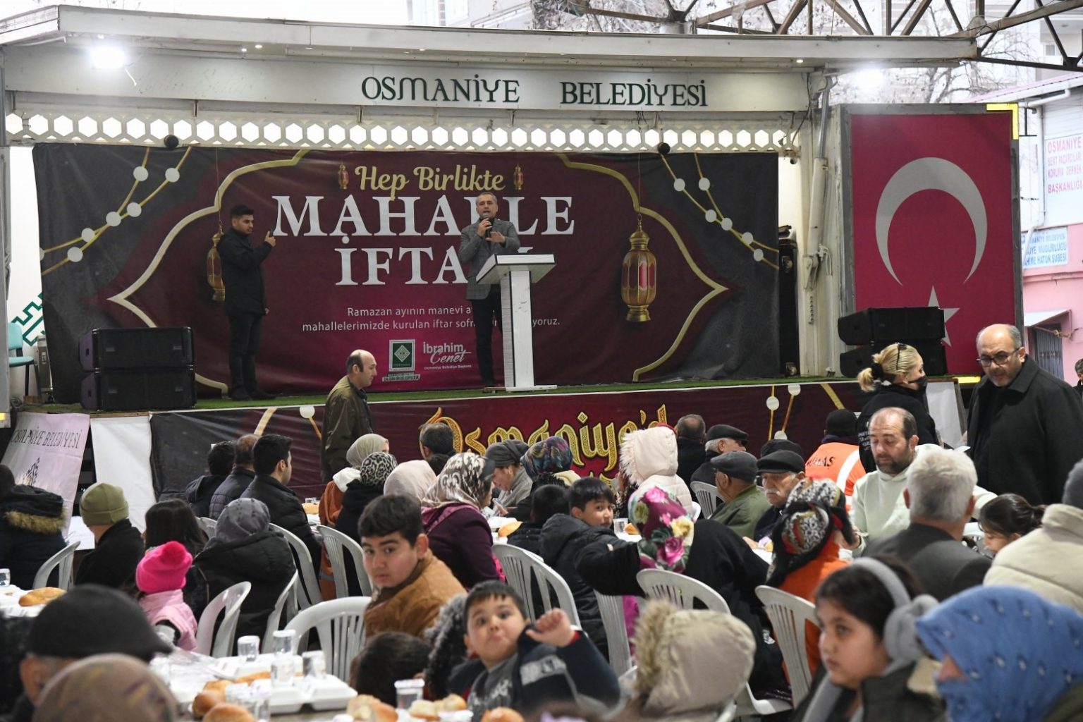 Osmaniye Belediyesi tarafından Salı Kapalı Semt Pazarı’nda düzenlenen mahalle iftarında bir araya gelen binlerce kişi, hep birlikte iftar yapmanın keyfini yaşadı. Kurulan devasa iftar sofrasında vatandaşlara “Hoş geldiniz” diyen Belediye Başkanı İbrahim Çenet, Ramazan ayında birlik ve beraberliğin önemine dikkat çekti.