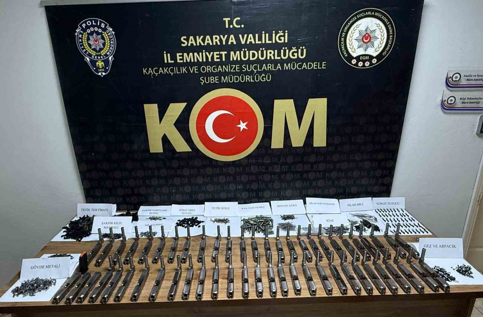 Hendek Cumhuriyet Başsavcılığı koordinesinde, Sakarya İl Emniyet Müdürlüğü KOM Şube Müdürlüğü ekiplerince silah kaçakçılığı ve ticaretinin önlenmesine yönelik yürütülen çalışmalar çerçevesinde N.K. isimli şahsın silah kaçakçılığı yaptığı tespit edildi. Teknik ve fiziki takibin ardından şüpheli, kullandığı araçla birlikte Hendek ilçesi Anadolu Otoyolu gişelerinde yakalanarak gözaltına alındı. Araçta yapılan aramalarda arka iki kapıya zulalanmış halde; 55 adet sürgü kapağı, 52 adet namlu, 46 adet sürgü tutucu, 45 adet icra mili ve yayı, 45 adet sürgü arka kapağı, 50 adet sürgü tutucu yayı, 44 adet gez, 74 adet arpacık, 235 adet silah mili, 44 adet iğne, 45 adet silah seri numarası, 42 adet gövde mandalı, 248 adet yay, 46 adet silah pimi, 45 adet kovan atıcı, 44 adet tetik kolu, 63 adet şarjör sabitleme klipsi, 55 adet sürgü tırnağı, 45 adet tetik, 44 adet tetik mekanizma metal bileşeni, 47 adet tetik mekanizma plastik bileşeni, 45 adet korkuluk ve 1 adet şarjör olmak üzere toplam bin 460 adet silah parçası ele geçirildi. Ele geçirilen silah parçalarıyla 55 adet tabanca yapılabileceği anlaşıldı. Emniyetteki işlemlerinin ardından adliyeye sevk edilen şüpheli N.K., çıkarıldığı mahkemece tutuklanarak cezaevine gönderildi.