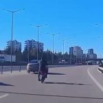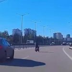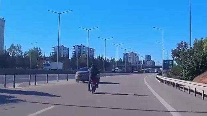 Adana’da bisiklet ile otoyolda şerit değiştiren bir kişinin kazaya sebebiyet verebilecek anları, araç içi kamerasıyla saniye saniye görüntülendi.
