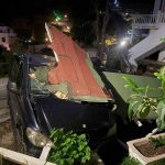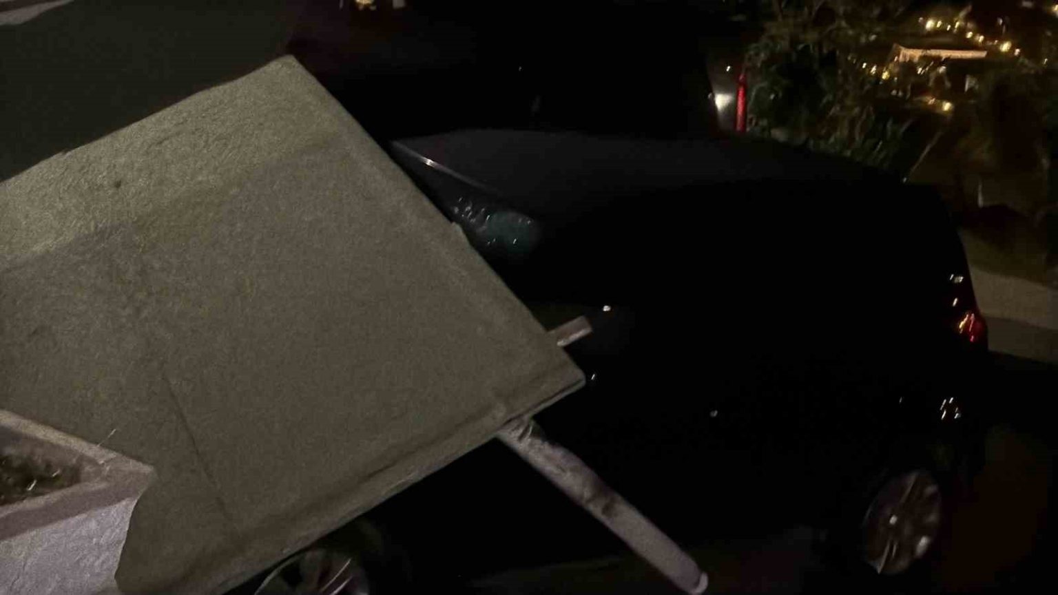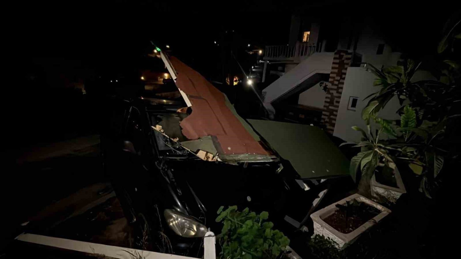 Muğla’nın Bodrum ilçesinde etkili olan fırtınada yerinden kopan sundurma, park halindeki araçların üzerine yıkıldı.