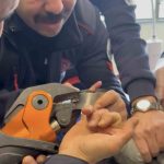 Elazığ’da parmağı çelik küllüğün deliğine sıkışan bebeğin imdadına itfaiye ekipleri yetişti. Hastanede ayırıcı ile küllük kesilerek bebeğin parmağı çıkarıldı.