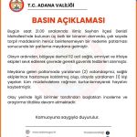 “Bugün saat 21.00 sıralarında ilimiz Seyhan ilçesi Denizli Mahallesi’nde bulunan üç katlı bir binanın damında, çok sayıda torpil maddesinin henüz belirlenemeyen bir nedenle patlaması sonucunda bir patlama meydana gelmiştir. Olayın ardından, bölgeye derhal 112 acil sağlık, emniyet ve itfaiye ekipleri sevk edilerek çevrede gerekli güvenlik tedbirleri alınmıştır. Meydana gelen patlamada yaralanan (2) vatandaşımız, sağlık ekiplerince hastaneye kaldırılmış olup, olayda yaralanan (1) kişi yapılan tüm müdahalelere rağmen kurtarılamayarak hayatını kaybetmiştir. Olay yerinde ilgili birimler tarafından başlatılan inceleme ve araştırma titizlikle devam etmektedir.”