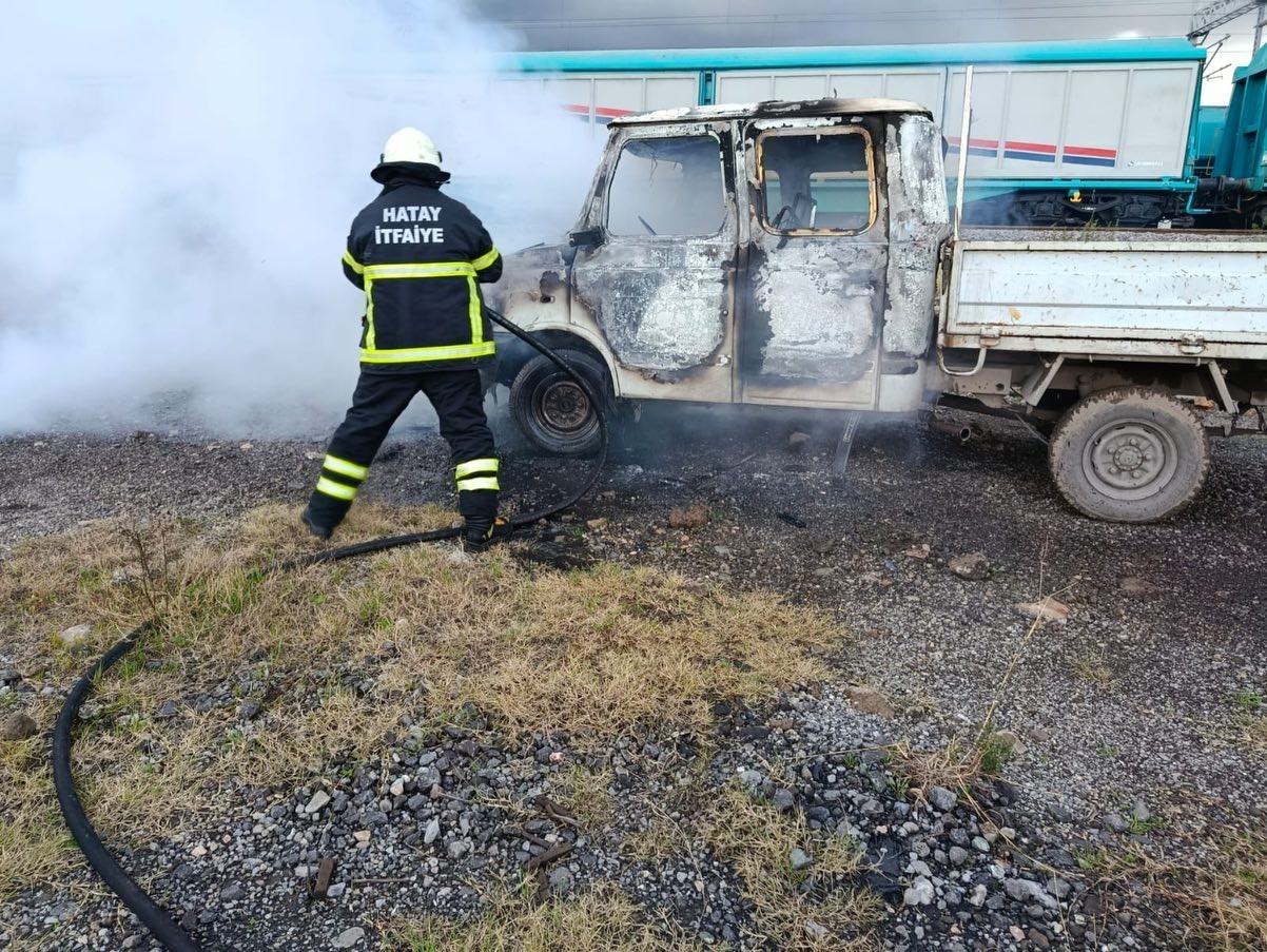 Hatay’da park halindeyken alevlere teslim olan kamyonet kullanılmaz hale geldi.