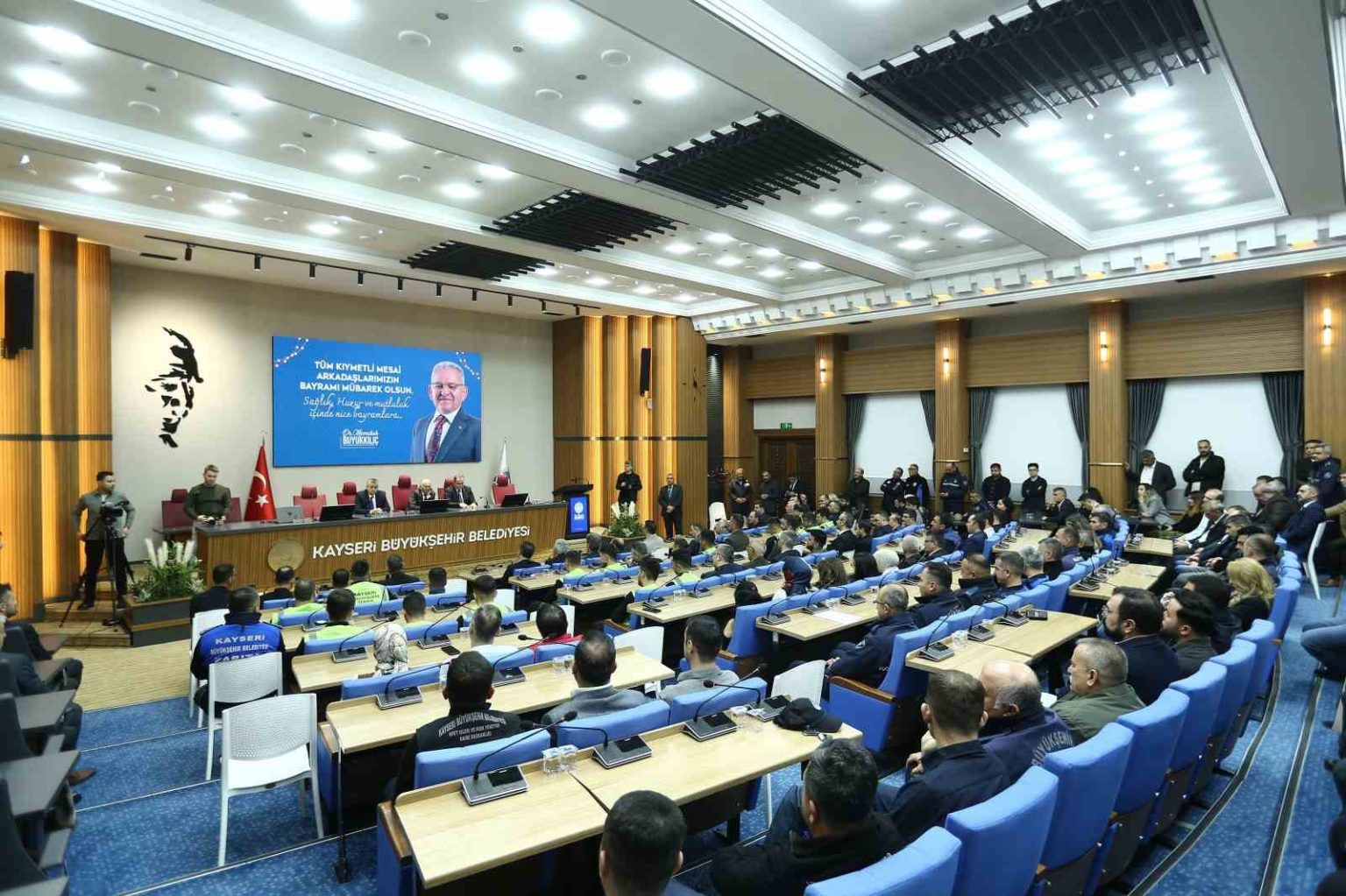 Kayseri Büyükşehir Belediye Başkanı Dr. Memduh Büyükkılıç, Ramazan Bayramı sonrası ilk mesai gününde, bayram süresince fedakârca görev yapan belediye personeliyle bayramlaştı. Başkan Büyükkılıç, Kayseri Büyükşehir Belediyesi’nin bir marka olduğunu belirterek, personeline “Tebessümü yüzünüzden eksik etmeyin” dedi.