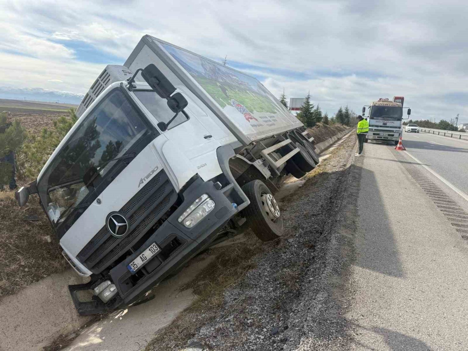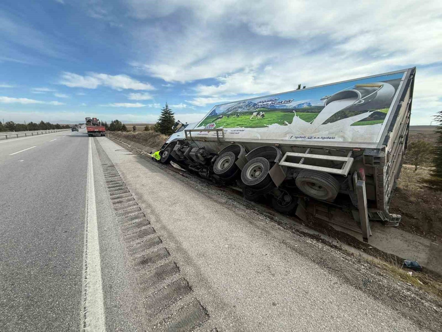 Afyonkarahisar’da kontrolden çıkan peynir yüklü bir kamyon refüje girerek yan yattı. Olayda ölen ya da yaralananın olmadı.