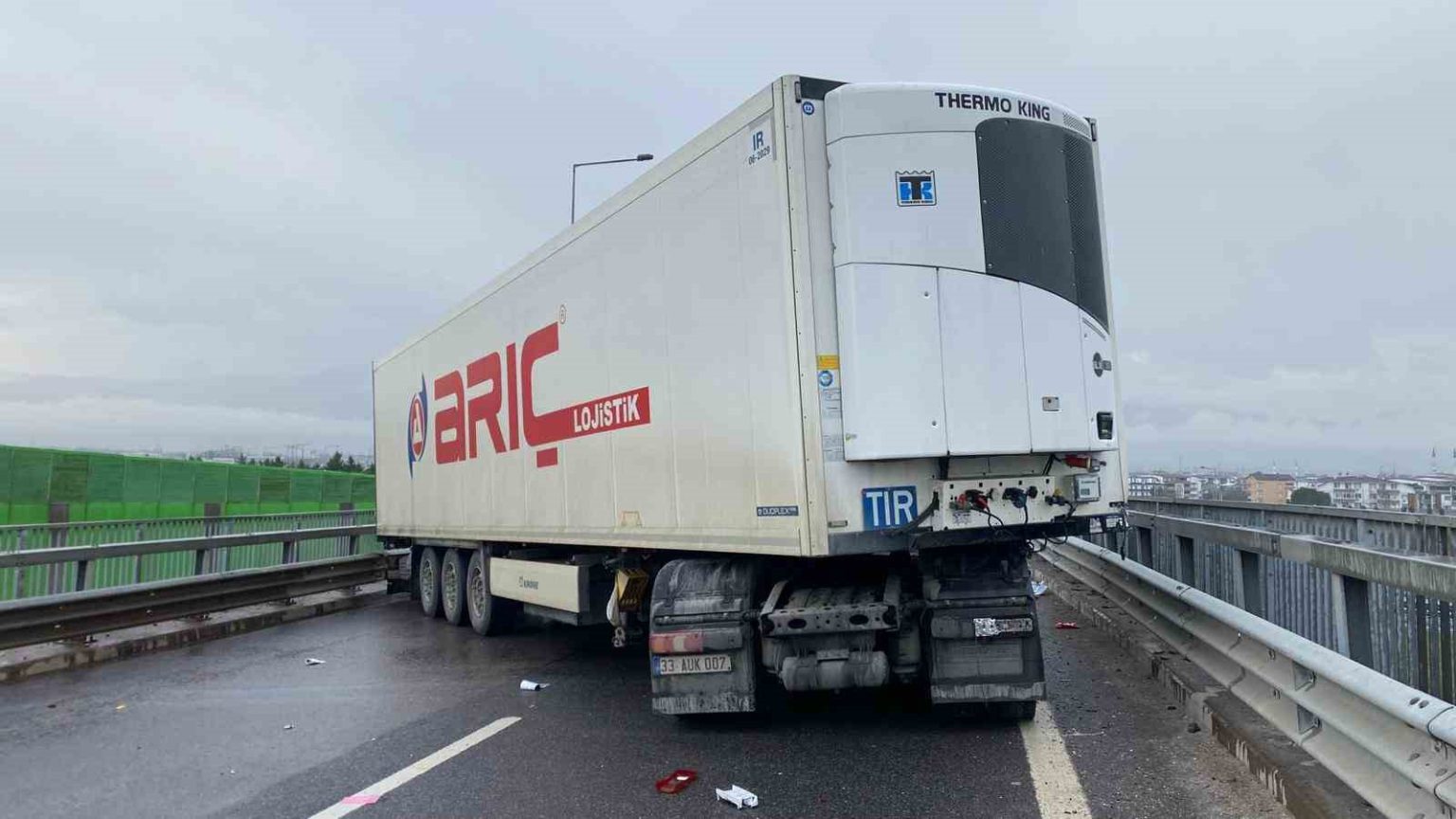 Kartepe ilçesi TEM Otoyolu’ndan Kuzey Marmara bağlantı yolundaki köprü üstünde trafik kazası meydana geldi. Yağışlı havanın etkisiyle kayganlaşan yolda seyir halinde olan Mercedes marka tır, sürücüsü A.K.’nin direksiyon hakimiyetini kaybetmesi sonucu makasladı. 33 AUK 007 plakalı tırın karıştığı kazanın ardından bölgeye sağlık ve jandarma ekipleri sevk edildi. Yapılan kontrollerde kazada yaralanan olmadığı belirlendi. Makaslayan tır, çekici vinci yardımıyla yoldan kaldırılırken, kısa süreli aksayan trafik çalışmaların tamamlanmasının ardından yeniden normale döndü.