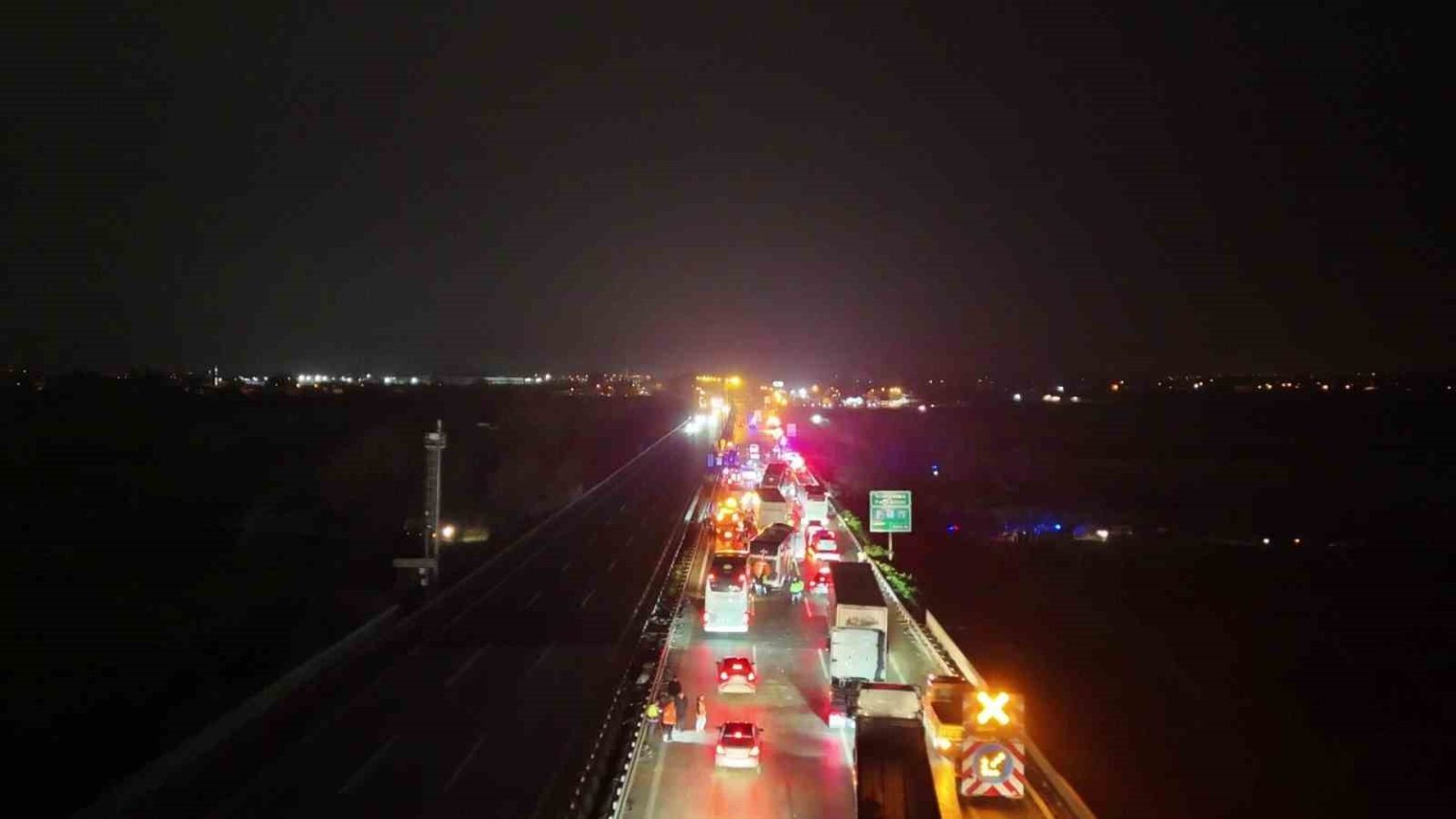 Anadolu Otoyolu’nun Sakarya geçişinde 16 aracın karıştığı zincirleme trafik kazasında, 4’ü ağır olmak üzere toplam 13 kişi yaralandı. Kazanın, yol kenarında yakılan lastiklerden çıkan yoğun duman sebebiyle meydana geldiği öne sürüldü. Meydana gelen kaza alanı havadan da görüntülendi.