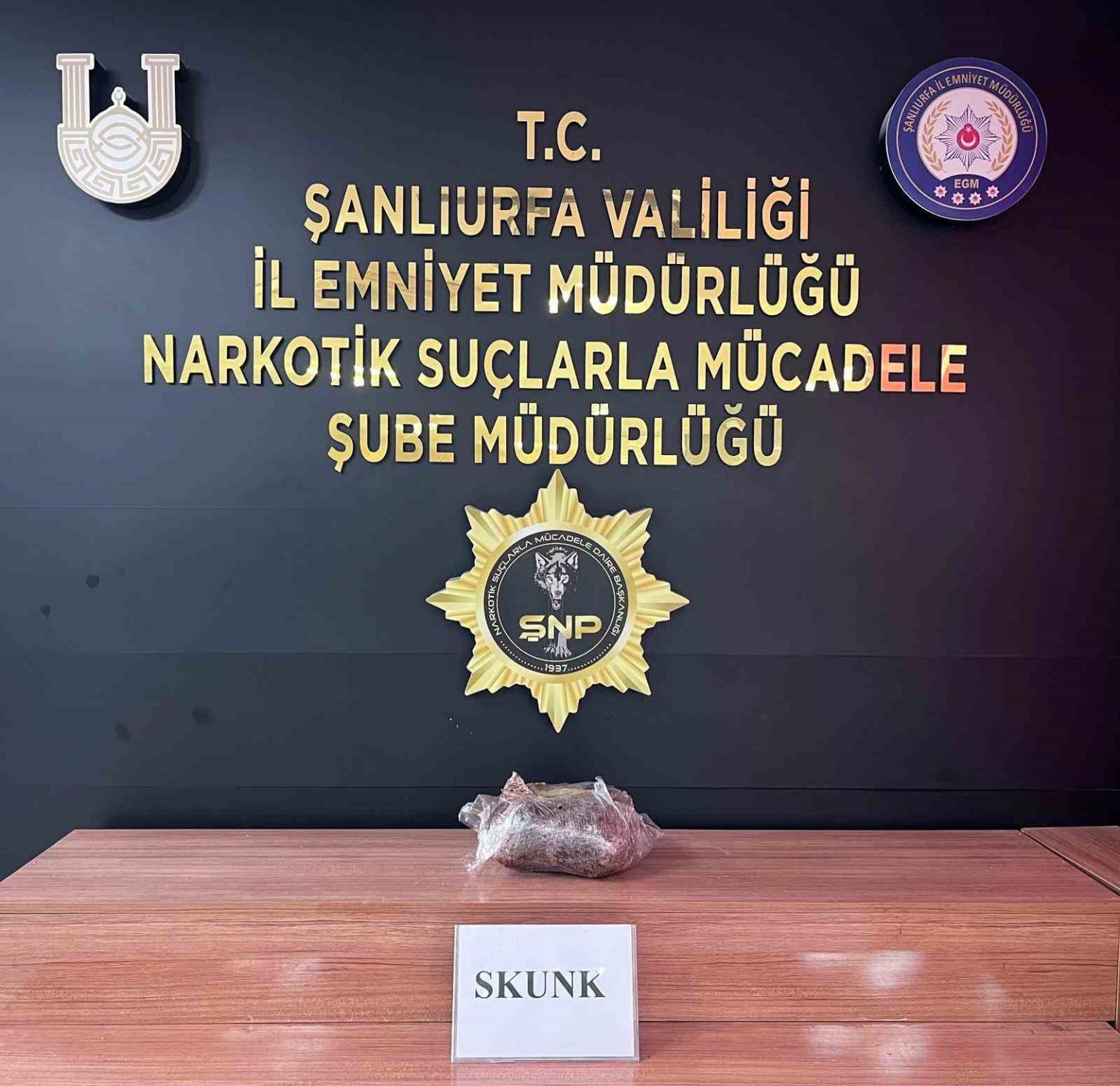 Edinilen bilgiye göre, Şanlıurfa İL Emniyet Müdürlüğü Narkotik Suçlarla Mücadele Şube Müdürlüğü ekipleri, şüpheli bir şahsı yakalayarak ilk önce üzerinde, daha sonra ise evinde arama yaptı. Yapılan aramalarda 2 kilo 150 gram skunk maddesi ele geçirildi. Gözaltına alınan şahıs, emniyetteki işlemlerinin ardından sevk edildiği mahkemece uyuşturucu madde imal ve ticareti yapmak suçundan tutuklanarak cezaevine gönderildi.