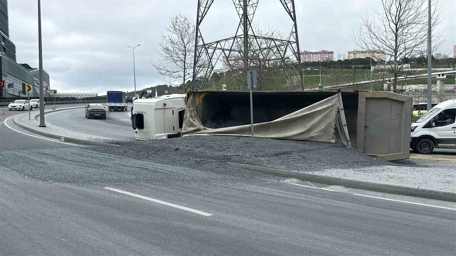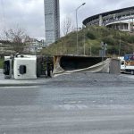 İstanbul’un Sarıyer ilçesinde mıcır yüklü hafriyat kamyonunun devrilmesi sonucu sürücü hafif şekilde yaralandı. Yolun bir kısmı mıcırla kaplanırken, trafik kontrollü olarak sağlandı.