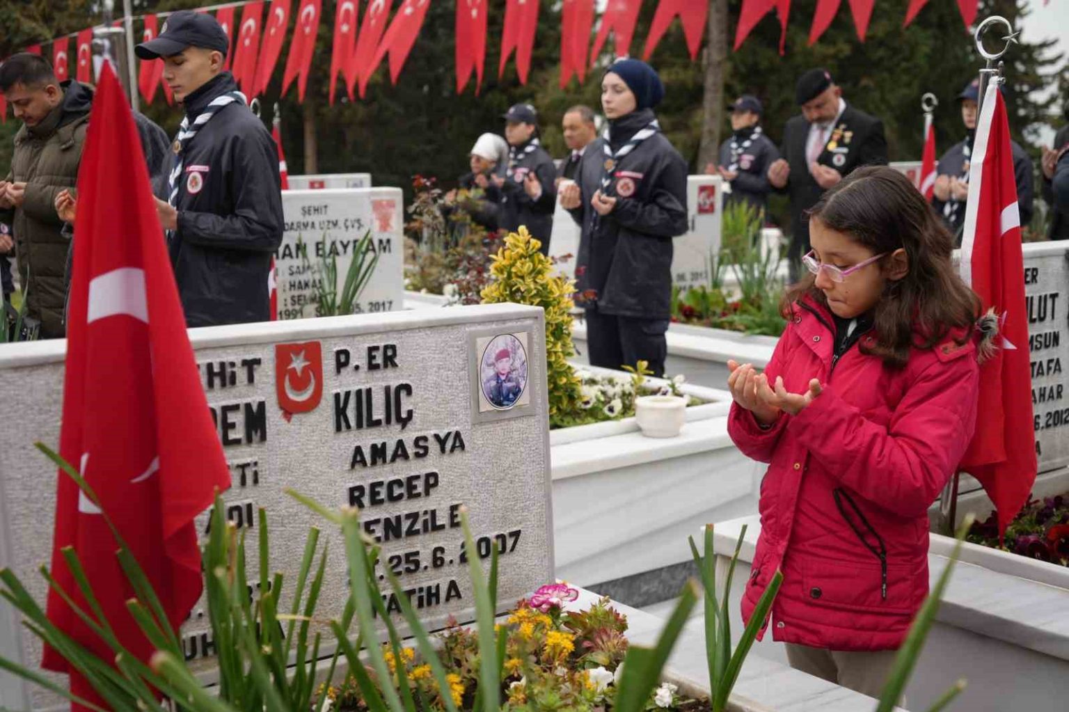 Törende şehitliklere karanfiller bırakılmadan önce Kur’an-ı Kerim tilaveti yapıldı. Bu sırada 8 yaşındaki Elif Kılıç, anneannesi Tenzile ve annesi Kübra Kılıç ile 2007 yılında şehit olan dayısı piyade er Muharrem Kılıç’ın mezarı başında dua etti. Elif Kılıç, bu esnada defalarca dayısının mezar taşındaki resmini öperek okşadı. O anlar törene katılanlara duygusal anlar yaşattı.