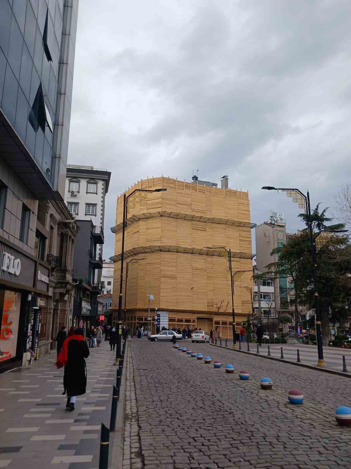 Trabzon kent merkezindeki en işlek noktalarından Uzunsokak’ın girişindeki bir iş merkezinde başlatılan tadilat çalışması nedeniyle tamamen kereste ile kaplanması ilginç bir görüntü oluşturdu. Çalışmalar kapsamında binanın cephesi, güvenlik amacıyla milyonlarca lira değerinde keresteyle kapatılırken, bina görüntüsü ile adeta bir hediye paketini andırdı.