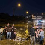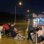 Kuşadası’nda etkili olan sağanak yağışta oluşan sel sularına gömülen minibüste can pazarı yaşandı. Mininüsteki 20 kişi ekiplerin ve vatandaşların yardımı ile kurtarılırken yaşanan can pazarı bir vatandaşın cep telefonu kamerasına yansıdı.