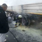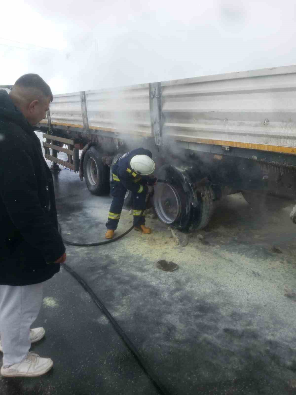 Van-Erciş kara yolunda seyir halindeki tırın yanan lastikleri itfaiye ekipleri tarafından söndürüldü.