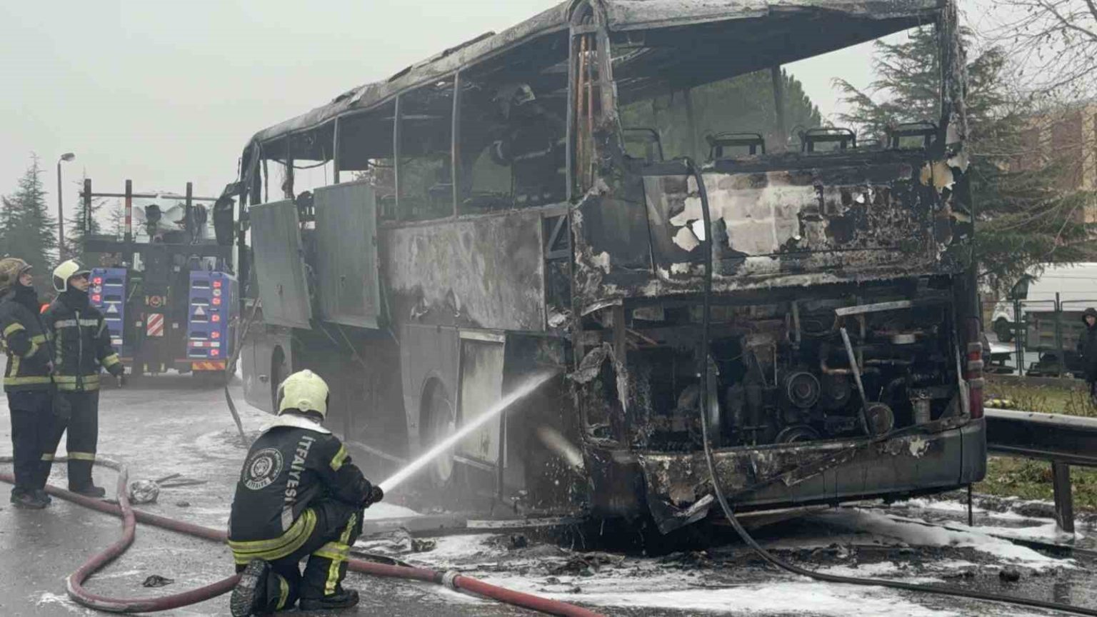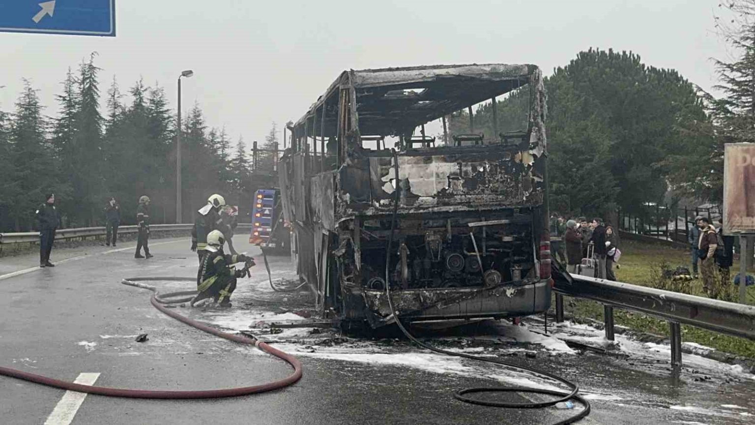 Kocaeli’de yolcunun yanık kokusunu fark ederek durumu görevlilere bildirmesi, şehirler arası yolcu otobüsünde yaşanabilecek faciayı önledi. Yolcuların tahliye edilmesinin ardından çıkan yangında otobüs hurdaya döndü.