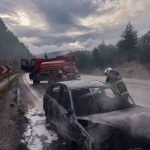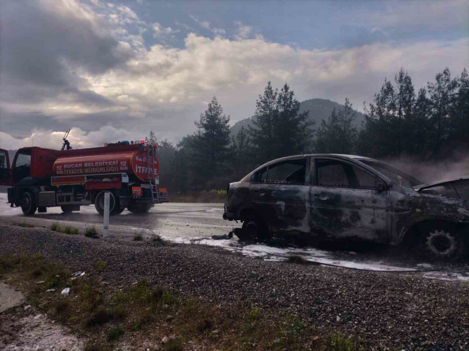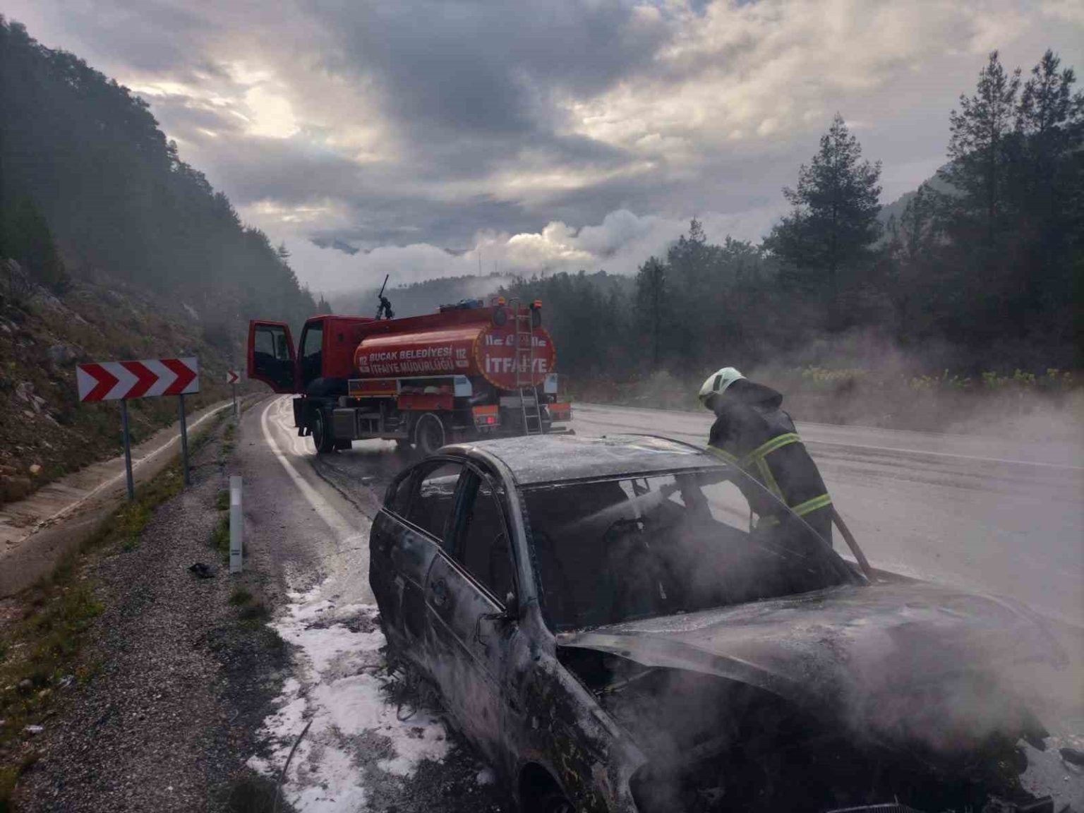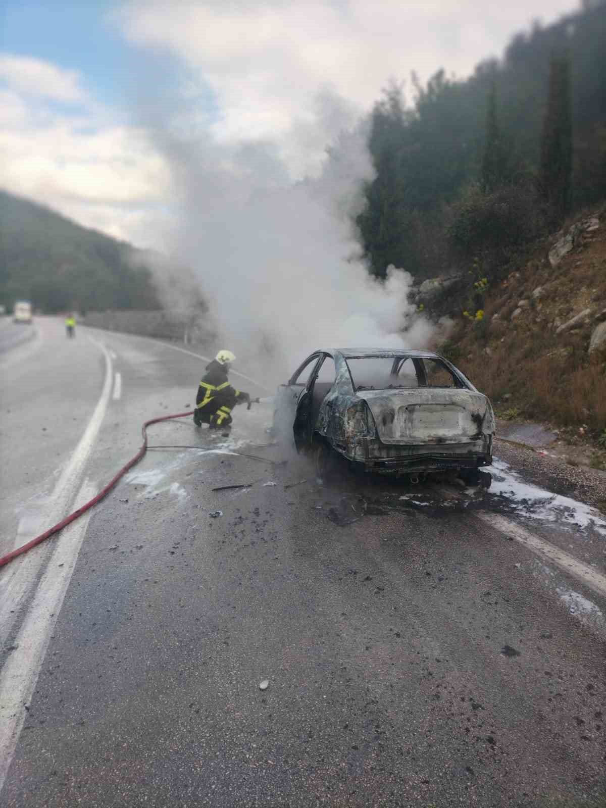Burdur’un Bucak ilçesinde seyir halindeyken araçta çıkan yangın itfaiye ekipleri tarafından söndürülürken araç kullanılmaz hale geldi.