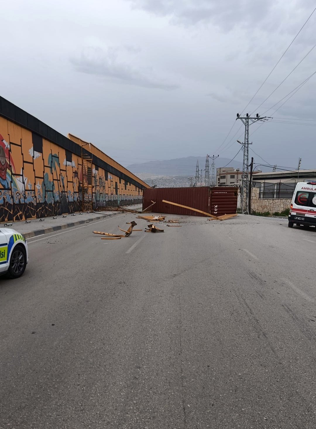 Olay; İskenderun – Payas yolu Akçay bölgesinde yaşandı. Seyir halinde ilerleyen tırın üzerinde bulunan konteyner, kuvvetli fırtınayla uçtu. Tırdan uçan konteyner, köprüden aşağı düştü ve yolu trafiğe kapattı. İhbar üzerine bölgede polis ekipleri tarafından güvenlik önlemi alındı. İskenderun İlçe Emniyet Müdürü Nevzat Güneş’de bölgeye giderek olay yerinde koordinasyonu sağladı. Öte yandan konteynerin tır üzerinden uçtuğu anlarsa seyir halindeki bir aracın kamerasına yansıdı. Konteynerin kaldırılmasıyla yol araç trafiğine yeniden açıldı.