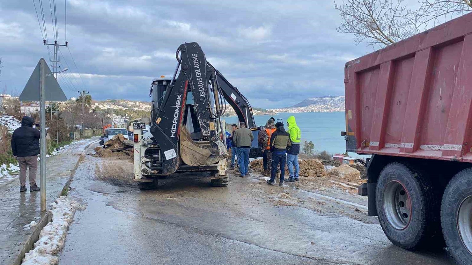 Sinop’ta yoğun kar yağışının ardından meydana gelen toprak kayması nedeniyle çöken yolda onarım çalışmaları başlatıldı.