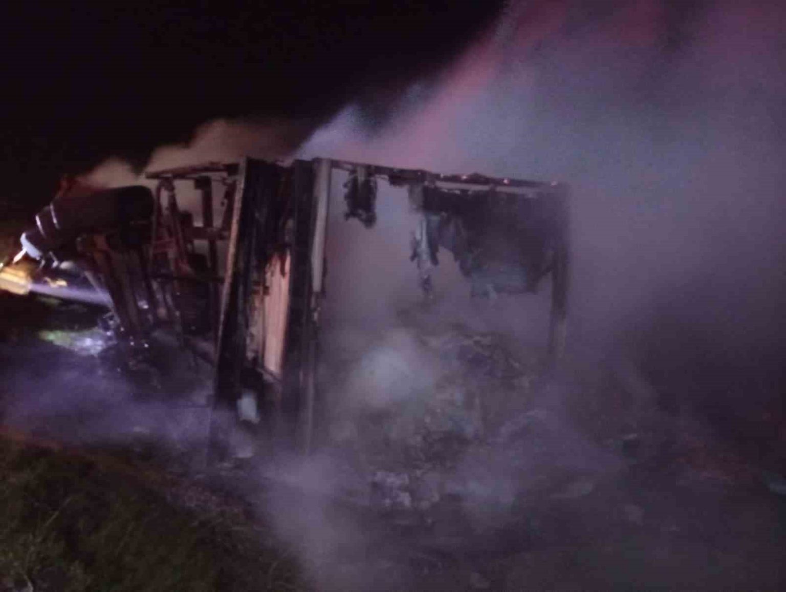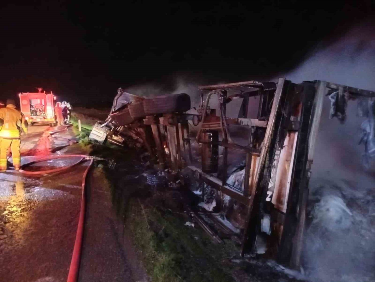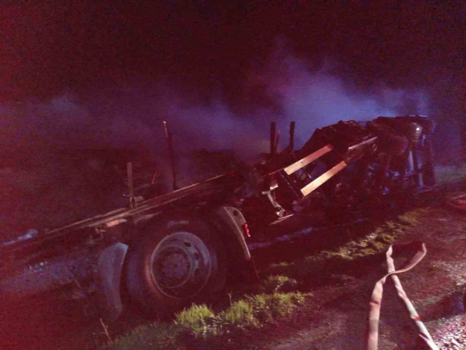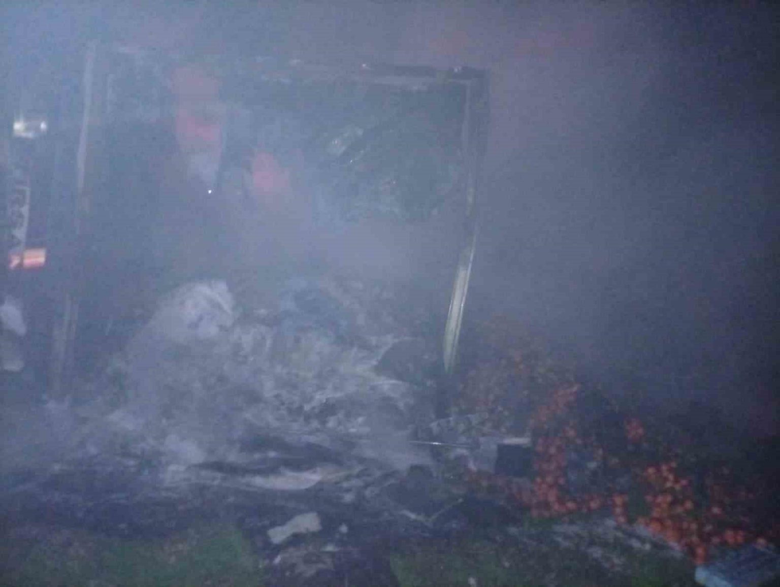 Şırnak’ta seyir halindeki mandalina yüklü tır alevlere teslim oldu. İtfaiye ekipleri tarafından söndürülen yangında tırdan geriye demir yığını kaldı.