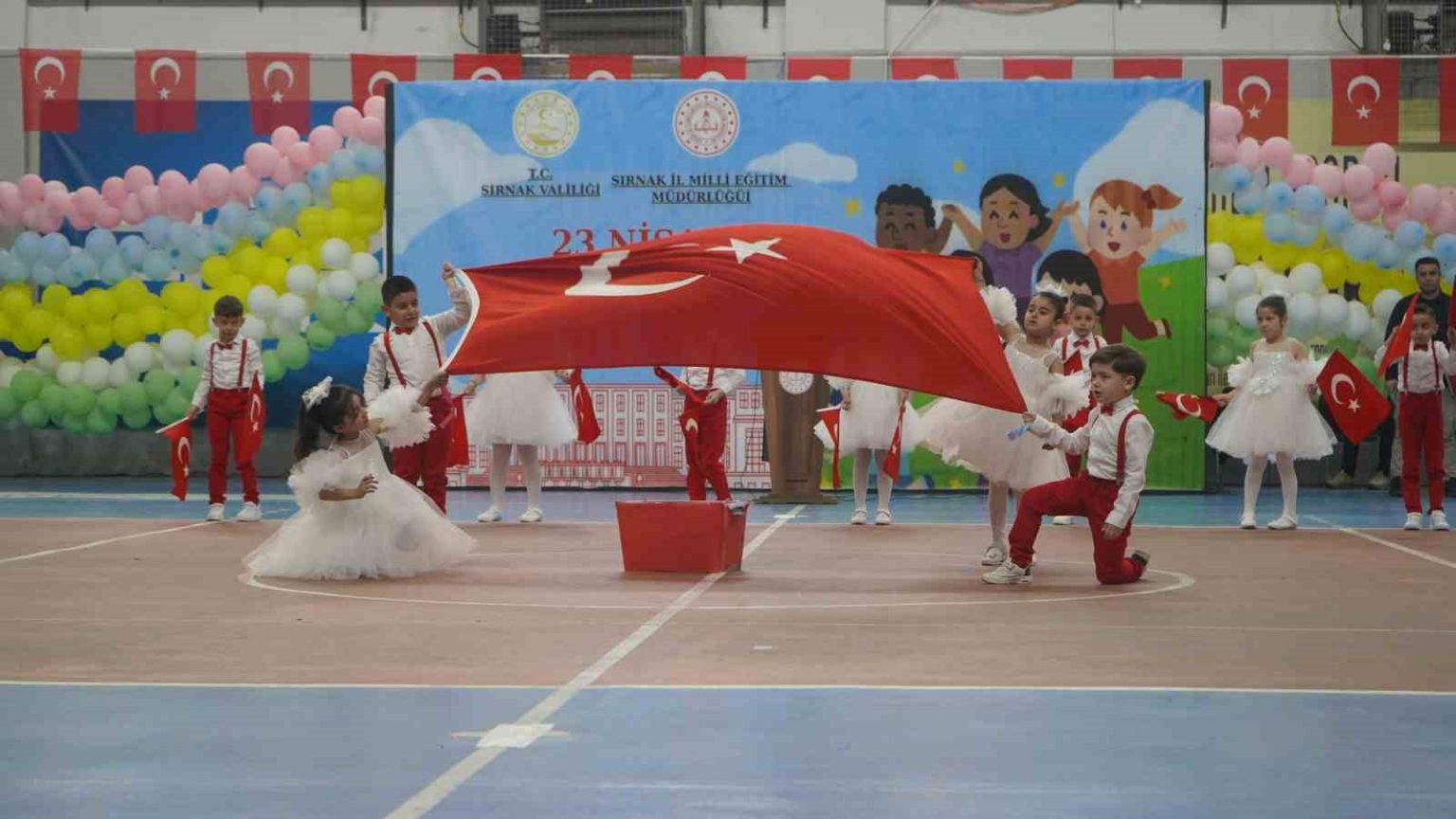 Şırnak Valiliği önünde İl Milli Eğitim Müdürü Hakan Cırıt tarafından Atatürk heykeline çelenk sunulmasının ardından kutlamalar Gençlik ve Spor İl Müdürlüğü’ne bağlı spor salonunda devam etti. Törende konuşan İl Milli Eğitim Müdürü Hakan Cırıt, 23 Nisan’ın çocuklara armağan edilen en önemli bayramlardan biri olduğunu belirterek, milli egemenliğin önemine dikkat çekti.