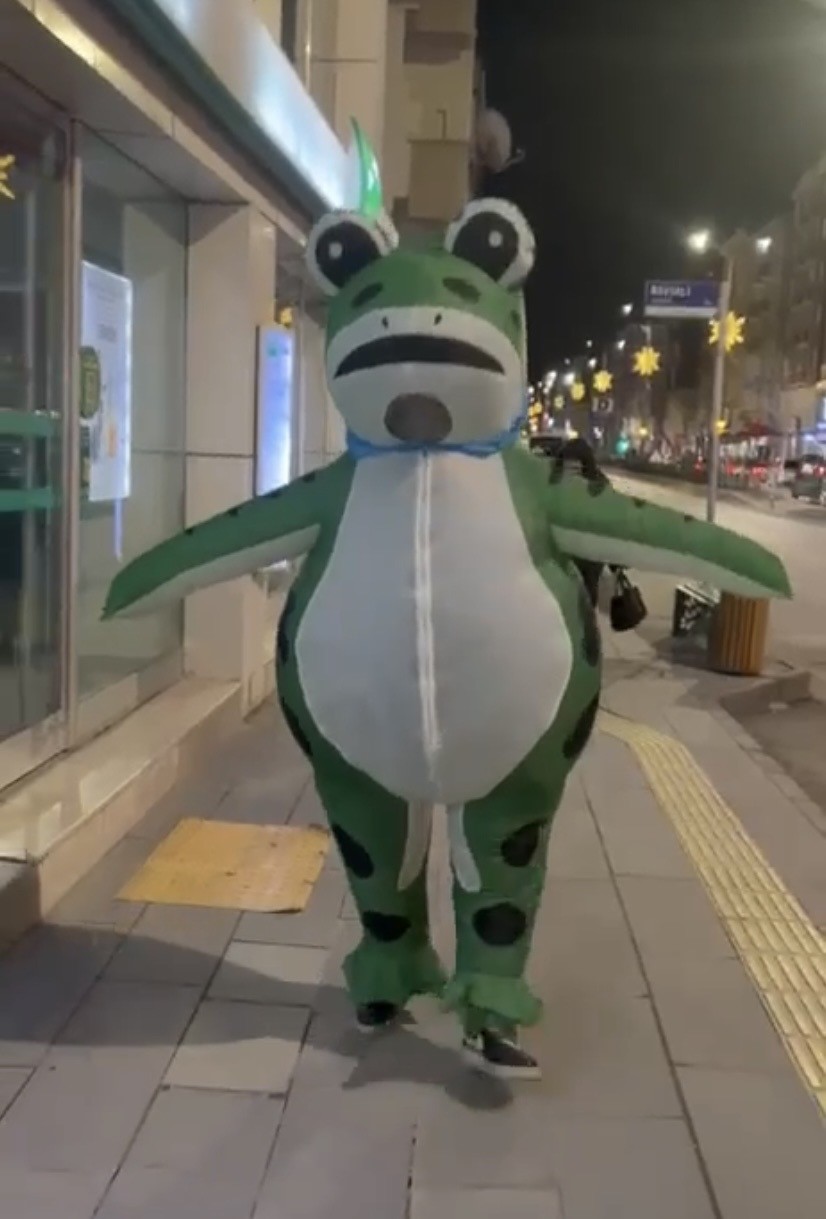 Şişme kurbağa kostümüyle caddede dolaştı, hem şaşırttı, hem gülümsetti