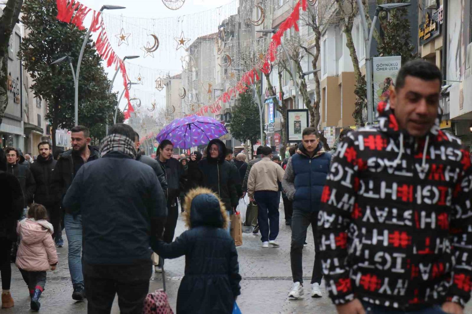 Sakarya’da etkisini gösteren soğuk hava ve yağmura rağmen vatandaşlar arife gününde bayramı alışverişi için sokaklarda yoğunluk oluşturdu.