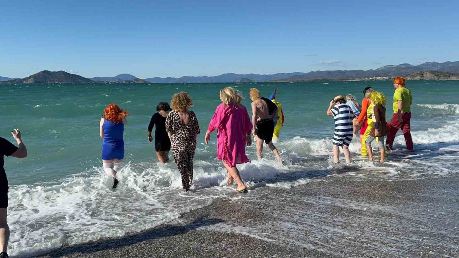 Muğla’nın Fethiye ilçesinde yaşayan çoğunluğu İngiliz uyruklu vatandaşlar, yeni yılın ilk gününde Çalış Plajı’nda renkli kostümlerle denize girerek ihtiyaç sahibi çocuklar ve hayvanlar için bağış topladı.
