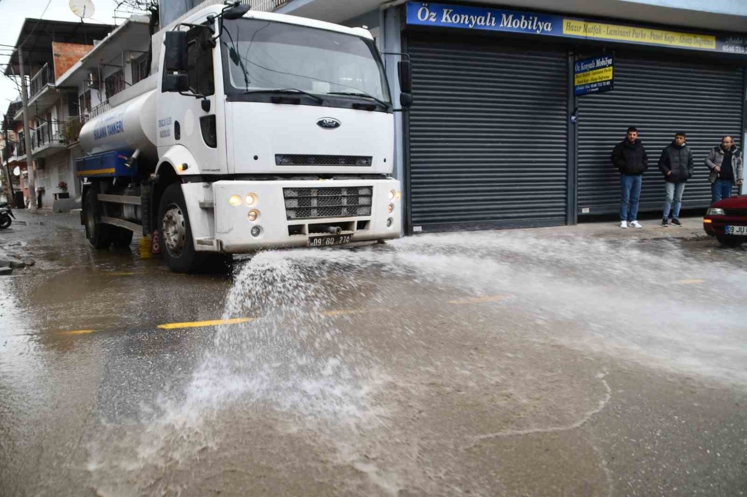 Selin hemen ardından harekete geçen Söke Belediyesi ekipleri, mağdur vatandaşların yardımına koştu. Baskın sularının çekilmesinin ardından evlerde, cadde ve sokaklarda oluşan çamur birikintileri belediye ekiplerinin çalışmalarıyla temizlenirken, selin bıraktığı izler başlatılan kapsamlı temizlik çalışmalarıyla ortadan kaldırılıyor. Çalışmalara Aydın Büyükşehir Belediyesi ekipleri de destek veriyor. Söke Belediyesi’nin tüm birimlerine bağlı saha ekiplerinin koordineli şekilde yürüttüğü çalışmaların, selden etkilenen tüm bölgelerde aralıksız sürdürülüyor. Dün bazı noktalarda gece saatlerinde de devam eden çalışmaların yanı sıra bugünün ilk ışıklarıyla birlikte tüm ekipler sahada yerlerini aldı.