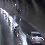 Amasya’da motosiklet sürücüsü tünelde sollamaya çalıştığı otomobilin önüne düştü. Motosikletlinin, ezilmekten son anda kurtulduğu o anlar kameraya yansıdı.