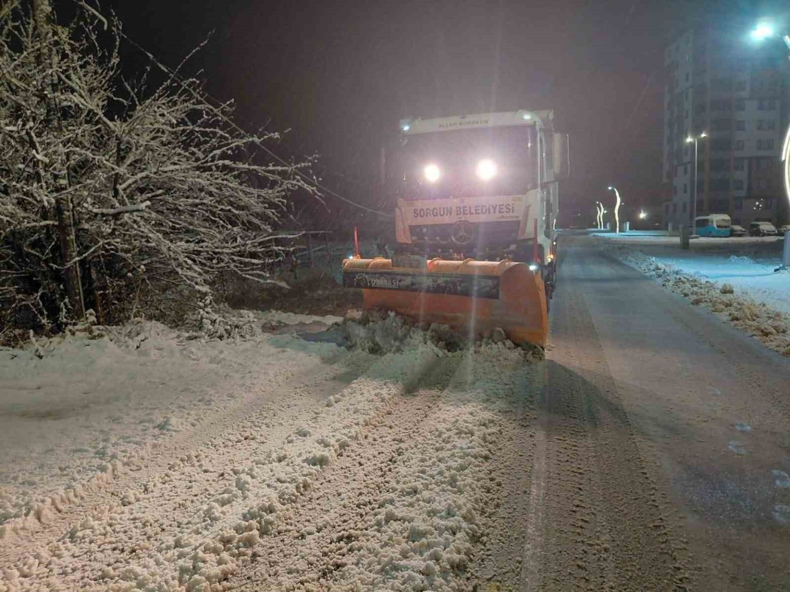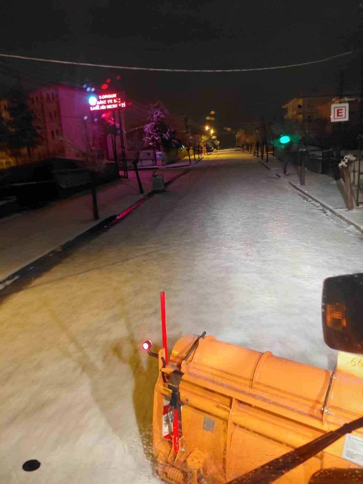 Gece etkisini göstermeye başlayan kar yağışının ardından Sorgun Belediyesi ekipleri, gece ve sabahın ilk ışıklarıyla birlikte kar küreme ve tuzlama çalışmalarına başladı.