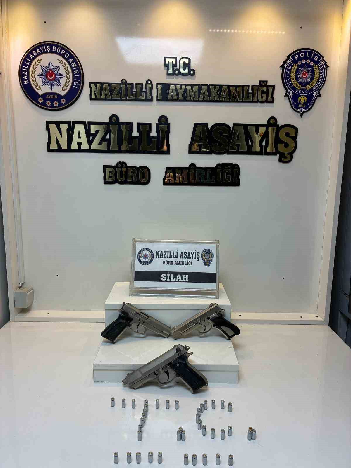 Edinilen bilgiye göre, Nazilli İlçe Emniyet Müdürlüğü ekipleri sosyal medya platformları üzerinden silah teşhiri yapan şahısların tespit edilmesi ve yakalanmasına yönelik çalışma başlattı. Yapılan çalışmalar kapsamında; V.P., Ş.K. ve H.K. isimli şahıslar düzenlenen operasyonla yakalandı. Şahısların ikametlerinde yapılan aramalarda adeta cephaneliği andıran çok sayıda silah ve mühimmat ele geçirildi. Aramalarda; 3 adet av tüfeği, 167 adet av tüfeği kartuşu, 5 adet kuru sıkı tabanca ve bu tabancalara ait 86 adet fişek ile 1 adet airsoft tabanca bulundu.