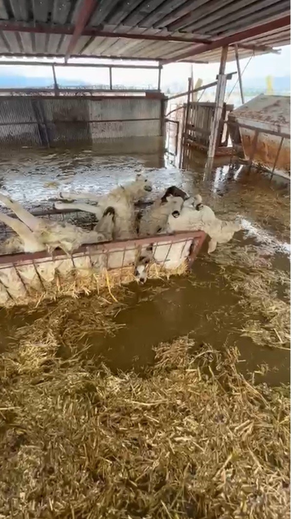 Aydın’ın Söke ilçesinde etkili olan sağanak sonrasında su basan hayvan damındaki 10 koyun telef oldu.