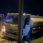 Tekirdağ’ın Ergene ilçesinde yoldaki koyun sürüsü nedeniyle kontrolden çıkan su tankeri beton direğe çarptı.