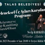Maneviyatın ve gönül ikliminin ön plana çıkacağı programda, sevilen sanatçı Necip Karakaya naatlar, ilahiler ve ezgilerle sahne alarak katılımcılara duygu dolu bir gece yaşatacak. Gönüllere hitap eden eserlerin seslendirileceği etkinlik, birlik ve beraberlik ruhunu pekiştirecek. Talas Belediye Başkanı Mustafa Yalçın, üç ayların toplumsal dayanışmayı ve manevi hassasiyetleri güçlendiren özel zamanlar olduğuna dikkat çekerek; “Bu mübarek zaman dilimlerinin ilçemize, ülkemize ve tüm İslam âlemine hayırlar getirmesini diliyorum. Tüm hemşehrilerimizi bu anlamlı gecede bir araya gelmeye davet ediyorum” diye konuştu.