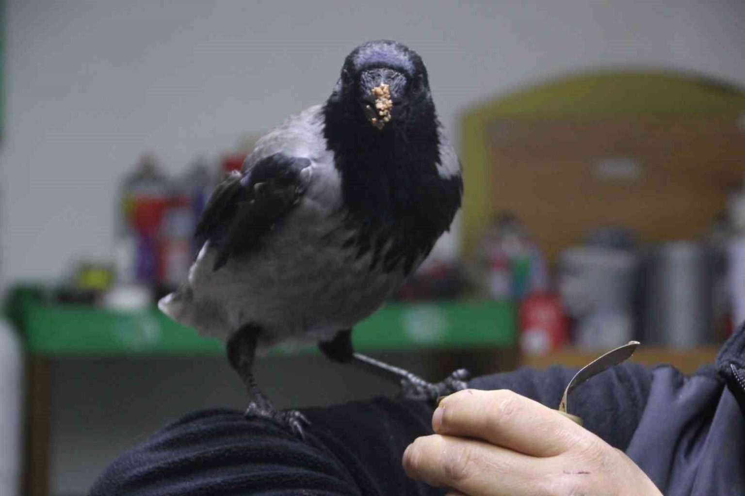 Karganın iş yerinin karşısındaki binanın çatısından düştüğünü söyleyen Serdar Hekim, “Buna martılar saldırdı. Ben de bunu martıdan kurtardım, böylelikle dostluğumuz başladı ve devam ediyor. Sonrasında doğaya bıraktım ancak uçamadığı için kediler saldırdı. Ben burada çalışırken bana yardım ediyor, kapılarda dolaşıyor. Fındık, fıstık, ceviz, haşlanmış yumurta, kedi maması gibi yiyecekler yiyor” dedi.