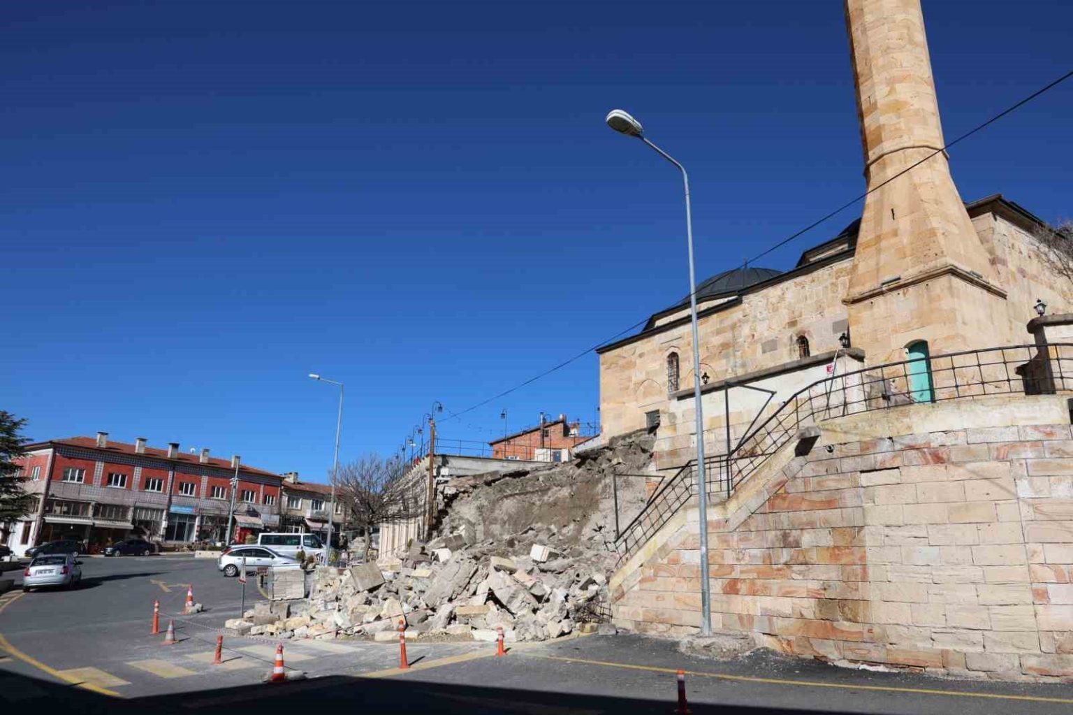 Olay, dün öğle saatlerinde meydana geldi. Edinilen bilgilere göre son günlerde bölgede aralıksız devam eden yağışlar zeminde yumuşamaya neden oldu. Yağışların ardından cami çevresinde bulunan istinat duvarı büyük bir gürültüyle çöktü. Bu sırada yoldan geçen bir vatandaşın son anda kaçması muhtemel bir facianın önüne geçti. Olayda herhangi bir can kaybı ya da yaralanma olmazken, cadde üzerinde park halinde bulunan bir araçta zarar meydana geldi. Çökme sonrası bölgede güvenlik önlemleri alınırken hasar tespit çalışmalarının başlatıldığı öğrenildi. Konunun ilgili kurumlara bildirildiği ve teknik incelemelerin sürdüğü belirtildi. Yetkililer; özellikle yoğun yağışların ardından benzer risklerin oluşabileceğine dikkat çekerek vatandaşları dikkatli olmaları konusunda uyardı.