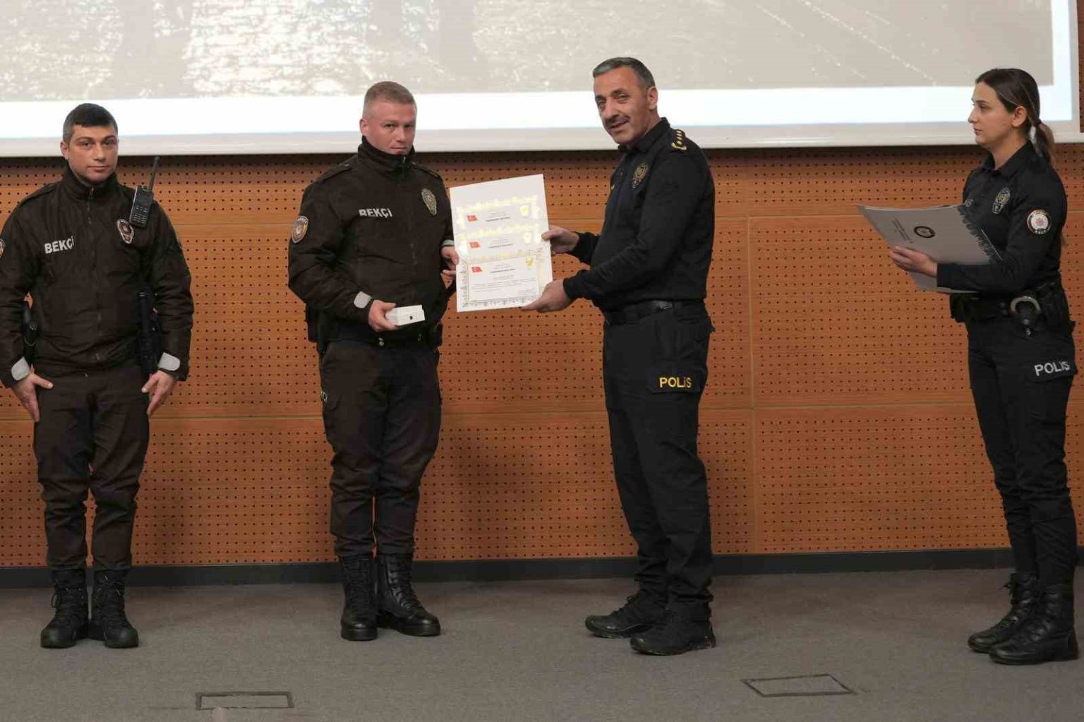 Toplantının ardından, halkın huzur ve güvenliği için gösterdikleri gayret ve başarılı çalışmaları dolayısıyla Çarşı ve Mahalle Bekçilerine İl Emniyet Müdür Yardımcıları tarafından teşekkür belgeleri takdim edildi.