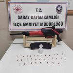 Saray İlçe Emniyet Müdürlüğü Asayiş Büro ekipleri, uyuşturucu tacirlerine ve ruhsatsız silah bulunduran şahıslara yönelik Ayaspaşa Mahallesi’nde iki ayrı operasyon düzenledi. Ayaspaşa Mahallesi Yakamoz Sokak’taki bir ikamete düzenlenen baskında G.C., B.C. ve M.C. isimli şahısların üzerinde yapılan aramalarda 3 parça halinde toplam 34 gram sentetik kannabinoid emdirilmiş tütün ele geçirildi. Aynı mahallede başka bir adreste ve içeride bulunan S.Ü.’nün üzerinde yapılan aramada da 33 adet sentetik ecza hapı ve 1 adet ruhsatsız av tüfeği bulundu.
