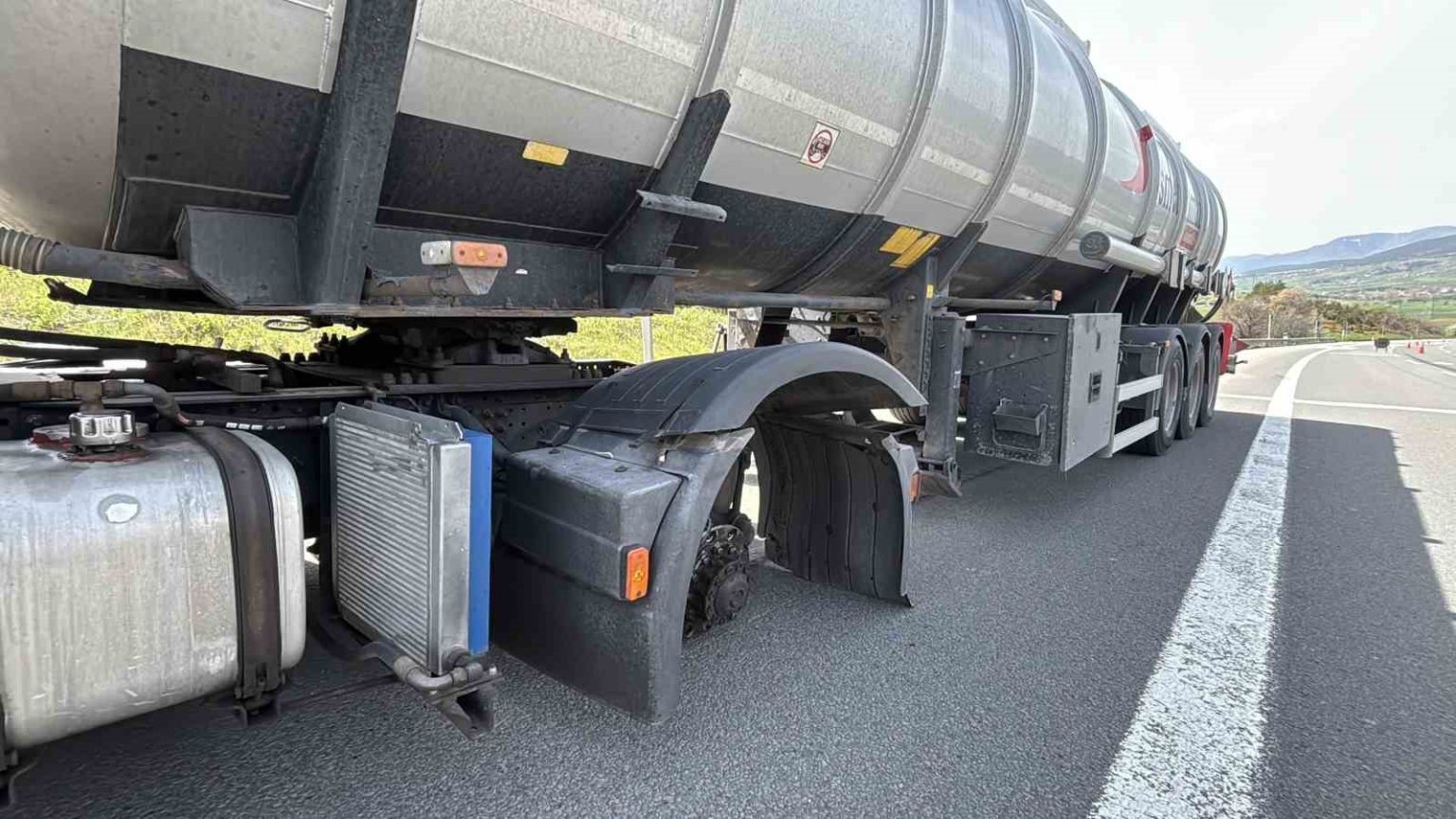 Ankara istikametine ilerleyen C.T. idaresindeki 27 ANL 388 plakalı tankerin bağlı olduğu tırın lastiği, seyir halindeyken henüz belirlenemeyen bir nedenle yerinden çıkarak yola savruldu. Bu sırada aynı istikamette orta şeritte seyreden Ali Hasanoğlu yönetimindeki 52 PA 330 plakalı kamyon, yola düşen lastiğe çarptı. Çarpmanın şiddetiyle lastiği altına alarak metrelerce sürükleyen kamyonda hasar oluştu. Sürücülerin yara almadan atlattığı kazanın ardından bölgeye sevk edilen kara yolları ve polis ekipleri, yolda güvenlik önlemi aldı. Kamyon, çağrılan çekici yardımıyla bulunduğu yerden kaldırıldı. Kazanın ardından yaşadığı paniği anlatan kamyon sürücüsü Hasanoğlu, “Kendi şeridimde ilerlediğim sırada önümdeki tırın lastiği fırladı. Lastiği önüme alıp buraya kadar sürükledim” ifadelerini kullandı.