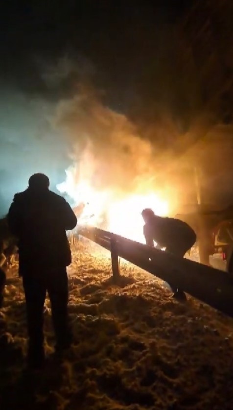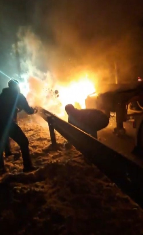 Tırda çıkan yangını söndürmek için elleriyle kar attılar