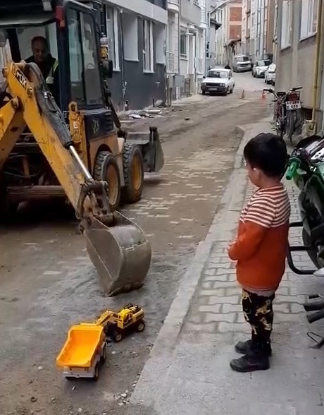 Yaşananları anlatan iş makinesi operatörü Mustafa Uçar, “Parke tamiratı yaparken annesi ve çocuğu çalışmalarımızı izliyordu. Çocuk, ‘Benim de kepçem ve kamyonum var’ diyerek bir süre sonra geri döndü. Oyuncak kamyon ve kepçeyi getirip yanımda oynamaya başladılar. O esnada bana, ‘Benim kamyonuma da hafriyat koyar mısın?’ diye sordu. Müdürümden izin alarak çocuğu mutlu ettik. Aile de mutlu oldu, çocuk da sevindi, biz de çok mutlu olduk” dedi.