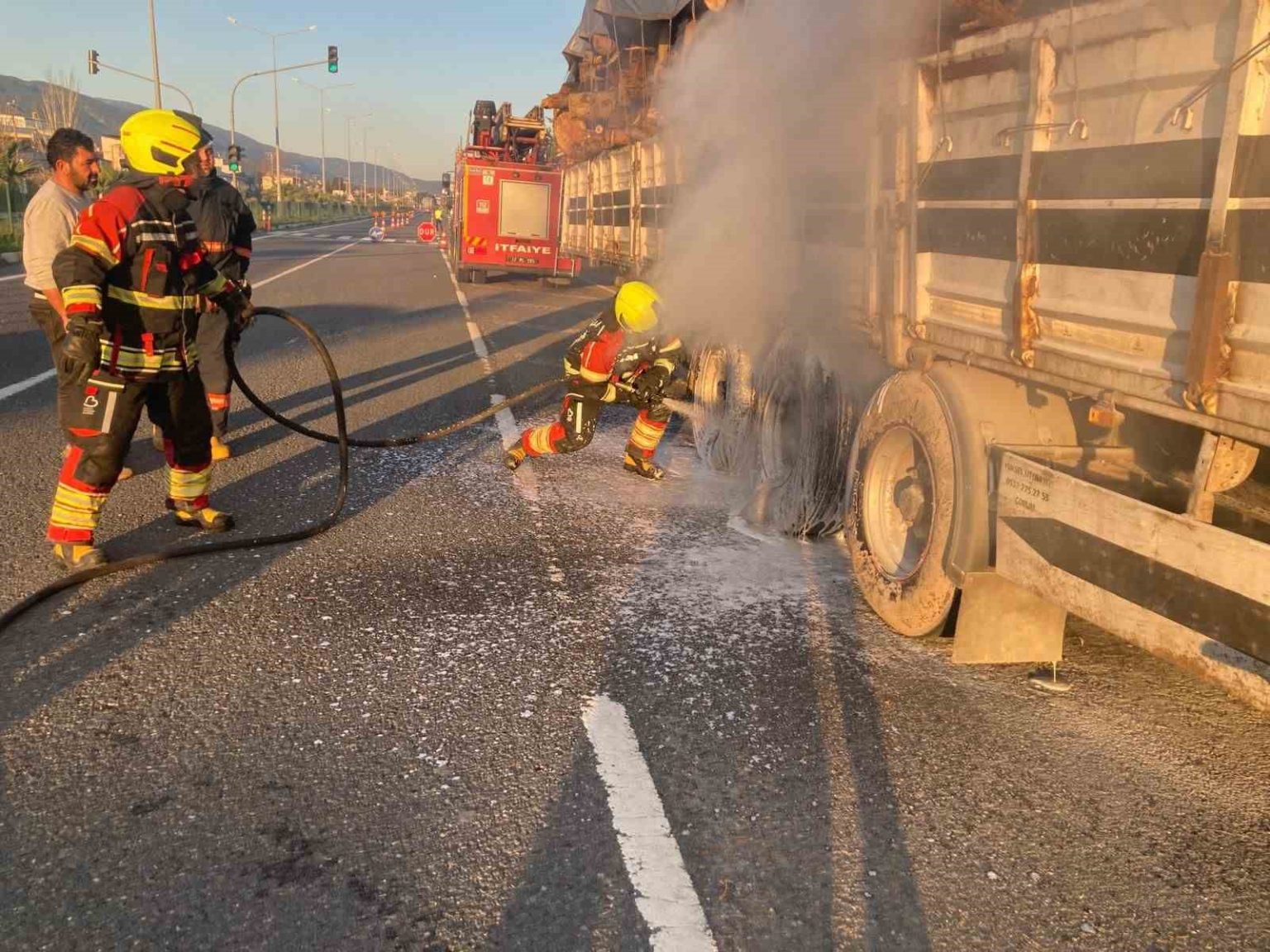 Balıkesir’in Edremit ilçesinde seyir halindeki tomruk yüklü bir tırın dorsesinde çıkan yangın, itfaiye ekiplerinin müdahalesiyle söndürüldü. E-87 karayolu üzerinde meydana gelen olayda facianın eşiğinden dönüldü.
