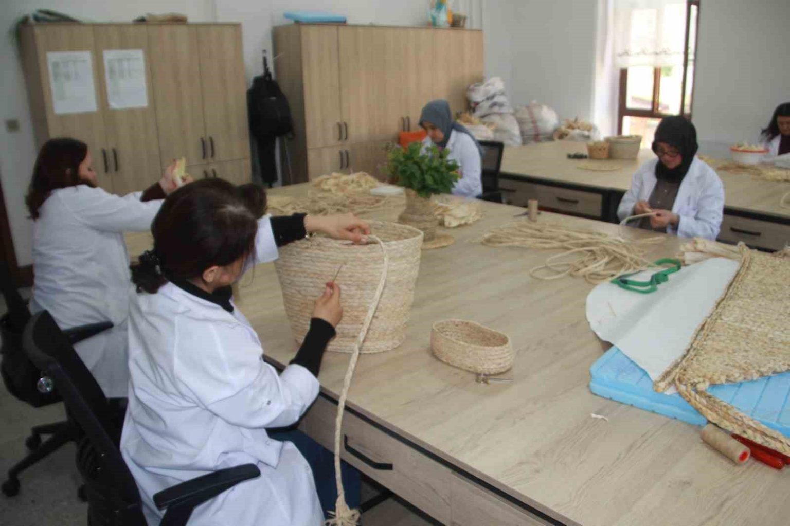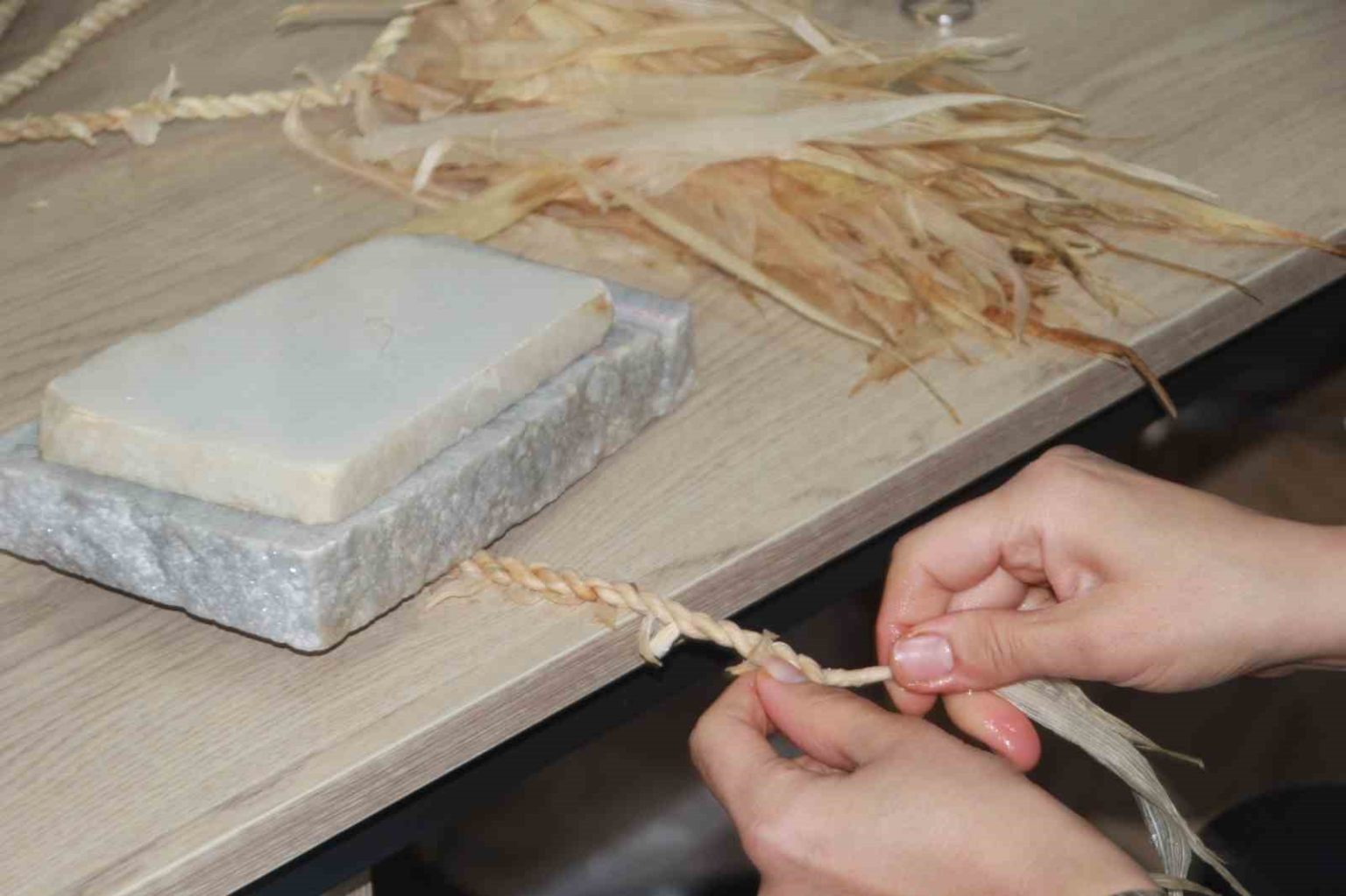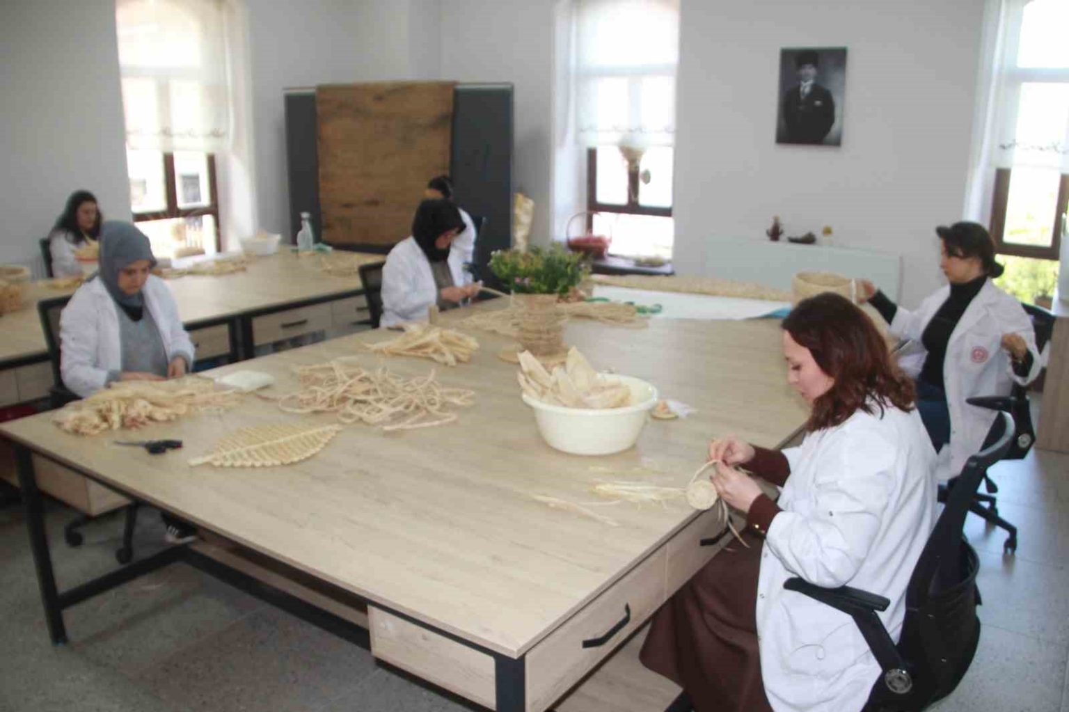 Bitkisel Örücülük Atölyesi’nde usta öğretici Zeliha Bektaş da mısır kabuğunun doğal yapısına uygun tekniklerle işlendiğini belirterek, üretim sürecinde emeğin yoğun olduğuna vurgu yaptı. Bektaş, “Mısır kabukları üreticilerimizden geliyor. Kurumumuzda yeniden işlenebilir hale getiriyoruz. İp formuna dönüştürdüğümüz kabukları, tasarlanan ürünlere göre örüyoruz. Ortaya çıkan her parça sadece bir ev ürünü değil, geçmişten bugüne taşınan bir üretim kültürünün yansıması. Zor bir zanaat ama severek yapıyoruz” ifadelerini kullandı.