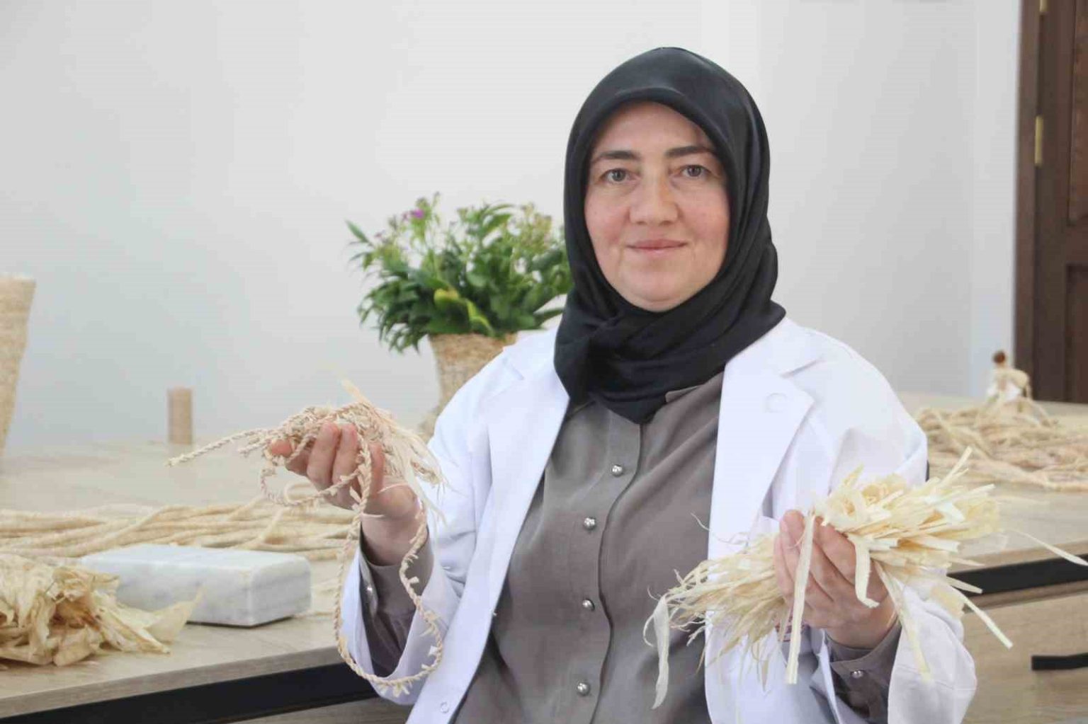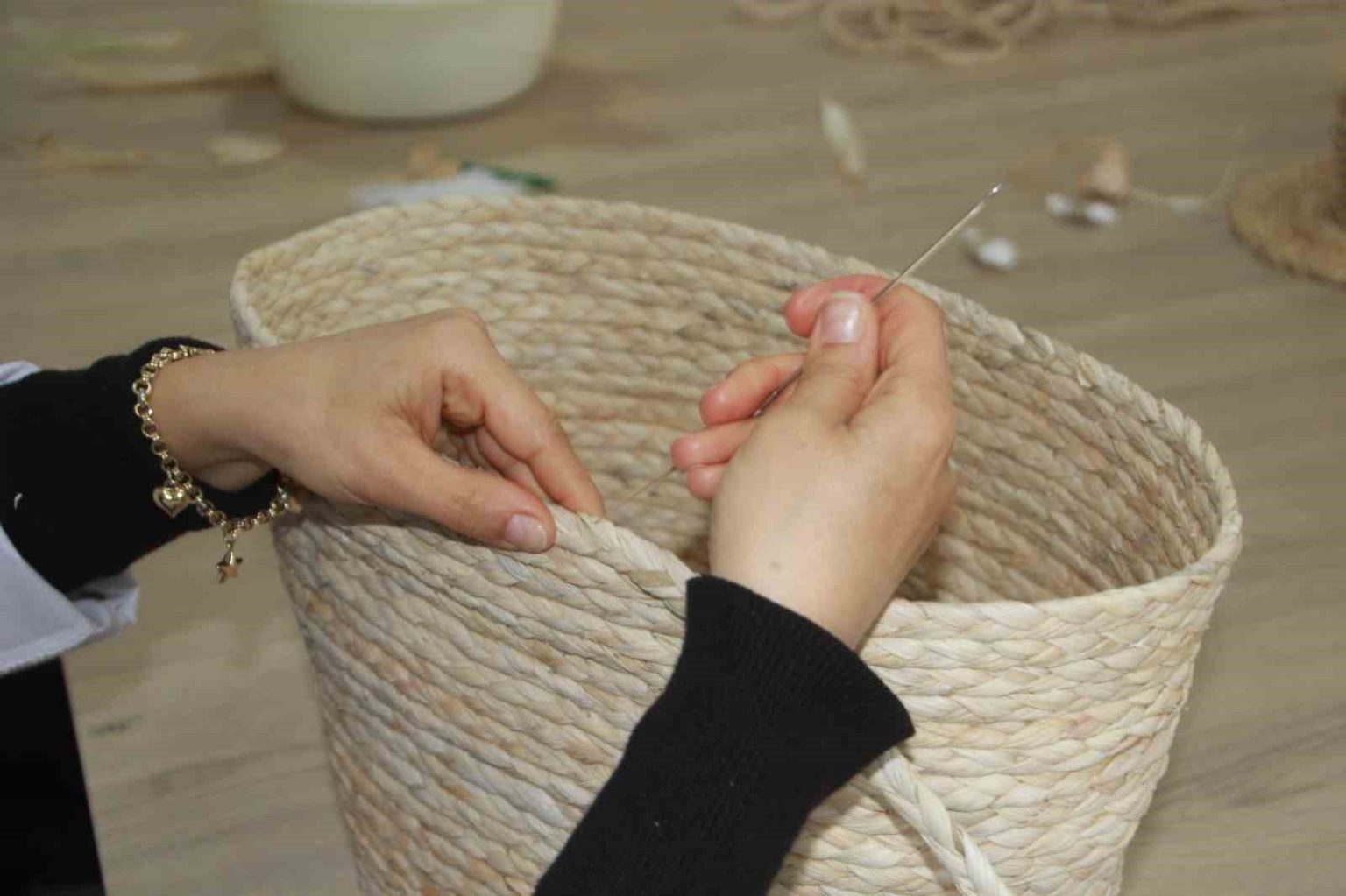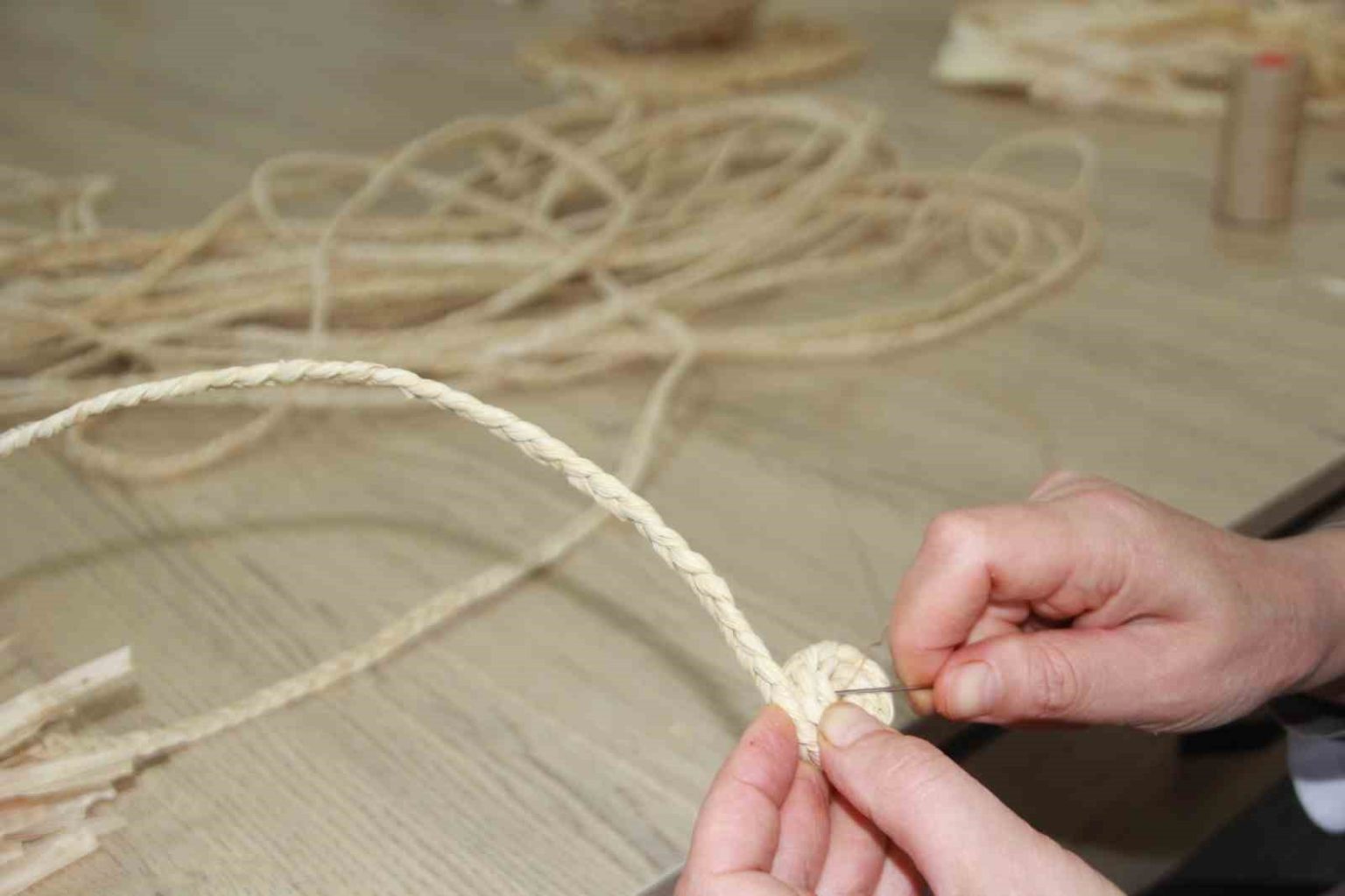 Bitkisel Örücülük Atölyesi’nde usta öğretici Zeliha Bektaş da mısır kabuğunun doğal yapısına uygun tekniklerle işlendiğini belirterek, üretim sürecinde emeğin yoğun olduğuna vurgu yaptı. Bektaş, “Mısır kabukları üreticilerimizden geliyor. Kurumumuzda yeniden işlenebilir hale getiriyoruz. İp formuna dönüştürdüğümüz kabukları, tasarlanan ürünlere göre örüyoruz. Ortaya çıkan her parça sadece bir ev ürünü değil, geçmişten bugüne taşınan bir üretim kültürünün yansıması. Zor bir zanaat ama severek yapıyoruz” ifadelerini kullandı.