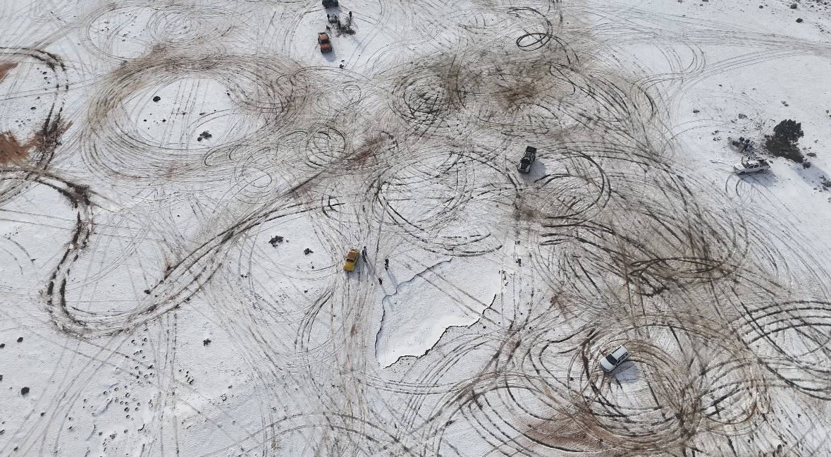 Bazı sürücülerin otomobil ve kamyonetlerle boş karla kaplı geniş arazide karda drift attığı anlar ise kameraya yansıdı.
