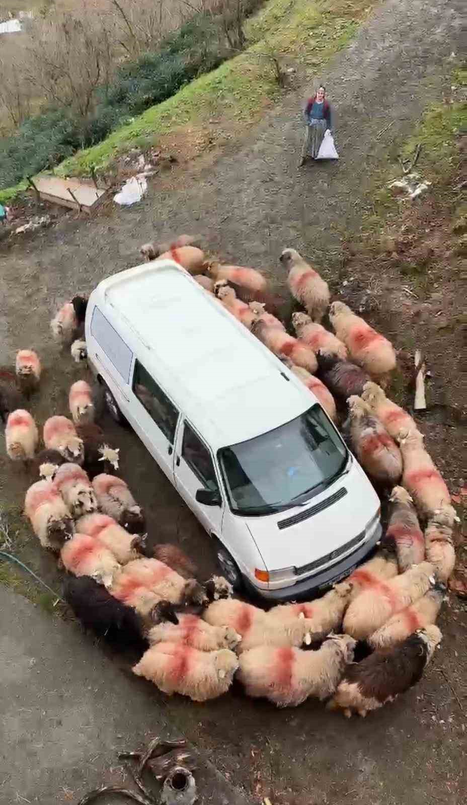 Trabzon’un kırsal bir mahallesinde ağıldan çıkan koyunlar, park halindeki minibüsün etrafında aynı anda dönmeye başlayınca ortaya ilginç görüntüler çıktı. Sürünün dakikalarca aracın çevresinde halka oluşturup dönmesi, cep telefonu kamerasına yansıdı.