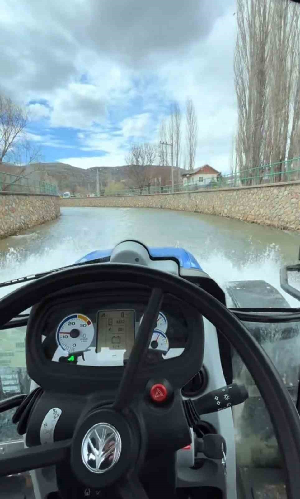 Konya’nın Bozkır ilçesinde bir çiftçinin temizlik amacıyla traktörüyle Çarşamba Kanalı’na girdiği anlar, çevredeki vatandaşlar ve sosyal medya kullanıcıları tarafından ilgiyle karşılandı.
