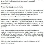 Ohio’da Japonya ile birlikte tarihin en büyük doğalgaz santralini kurarak 9,2 gigawatt elektrik üreteceklerini belirten Lutnick, “Bu sayede şebeke güvenilirliğini artıracak, baz yük gücünü genişletecek ve uygun fiyatlı enerji ile Amerikan imalatını destekleyeceğiz” dedi. Amerika Körfezi’nde kritik öneme sahip bir derin su ham petrol ihracat tesisi inşa edileceğini ifade eden Lutnick, “Bu projenin ABD’nin ham petrol ihracatında yıllık 20-30 milyar dolarlık bir katkı sağlaması, rafinerilerimizin ihracat kapasitesini güvence altına alması ve Amerika’nın dünyanın önde gelen enerji tedarikçisi konumunu güçlendirmesi beklenmektedir” değerlendirmesinde bulundu. Üçüncü proje kapsamında ise ABD’nin sentetik endüstriyel elmas üretim kapasitesinin oluşturulacağını vurgulayan Lutnick, “Bu sayede, ileri endüstriyel ve teknolojik üretim için kritik öneme sahip sentetik elmas kumuna olan ABD talebinin yüzde 100’ünü yurt içinde karşılayacağız. Artık bu temel malzeme için yabancı tedarikçilere bağımlı olmayacağız” dedi.