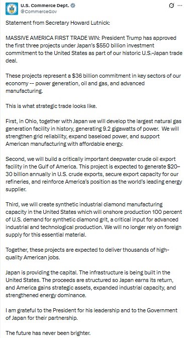 ABD Ticaret Bakanı Howard Lutnick ise, yaptığı yazılı açıklamada Trump’ın Japonya ile varılan ticaret anlaşmasında yer alan 550 milyar dolarlık yatırım taahhüdü kapsamındaki ilk 3 projeyi onayladığını ifade etti. Bu projelerin enerji üretimi, petrol ve doğalgaz ile ileri imalat alanlarında yapılacak 36 milyar dolarlık bir yatırım taahhüdünü temsil ettiğini aktaran Lutnick, “Stratejik ticaret işte böyle bir şey” ifadelerini kullandı.